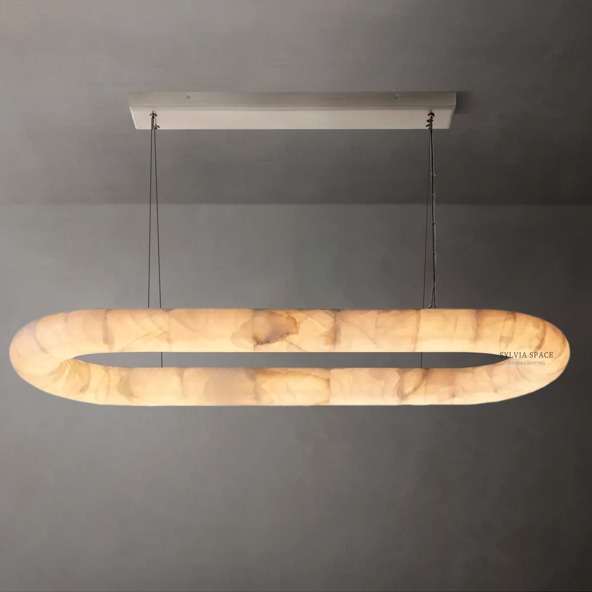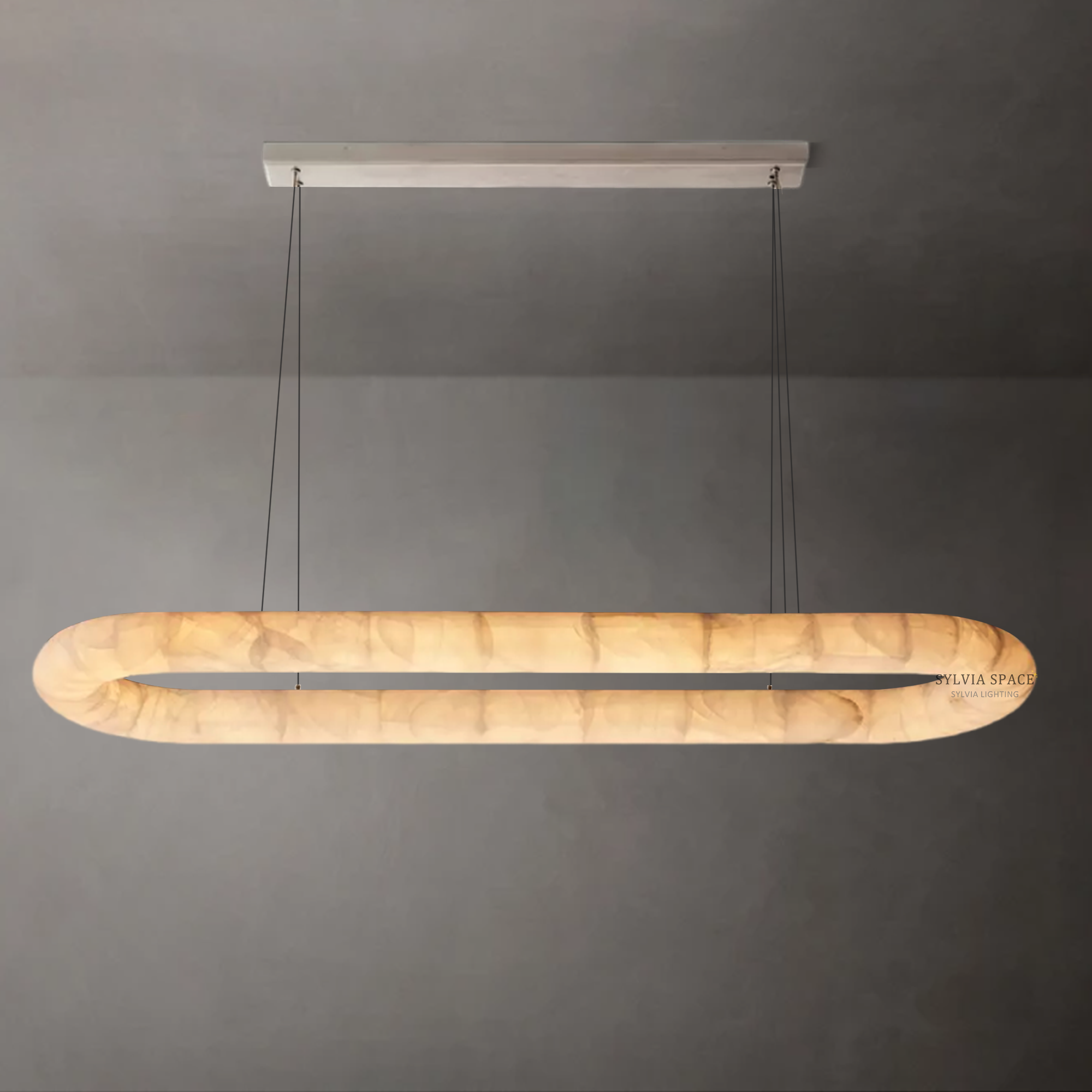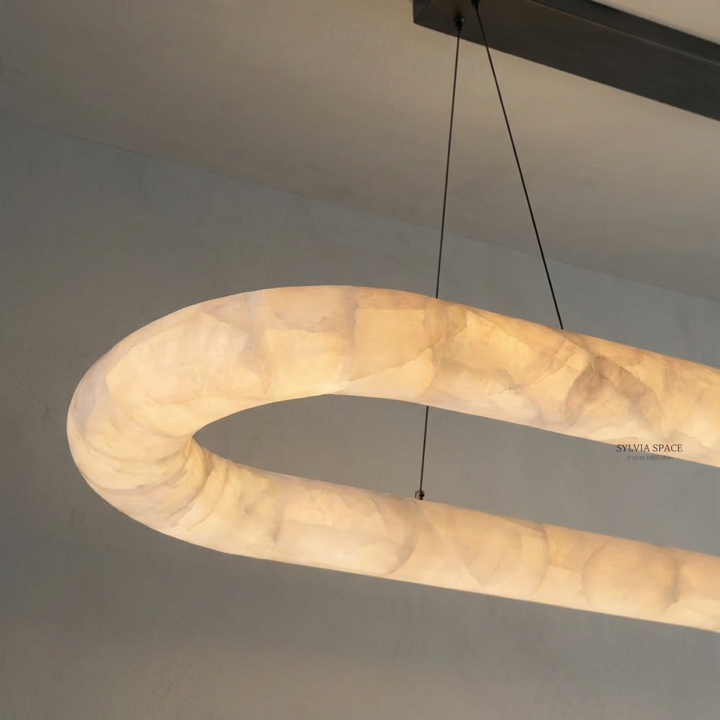 Introducing the Rivager Lisse Oval Chandelier 57, crafted in luminous alabaster to create a softly radiant focal point. Light pools at the center of the stone and gently spreads outward in delicate tonal shifts, accentuating alabaster's natural depth and warmth. Once illuminated, the alabaster reveals feathered marbling that brings a sense of intimacy and quiet luxury to any space. Its serene glow is especially suited to reading corners, warm transitional zones, and interiors that celebrate tactile, natural materials.