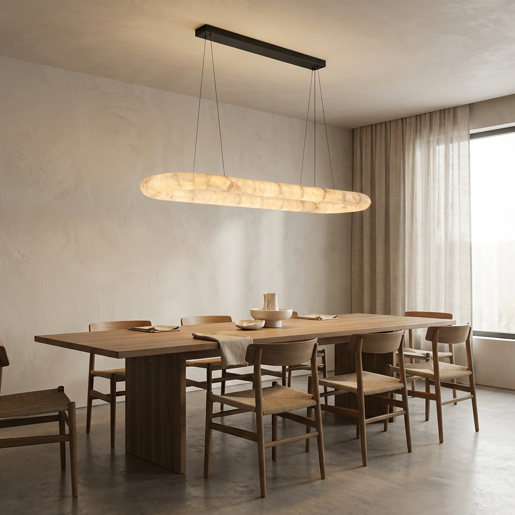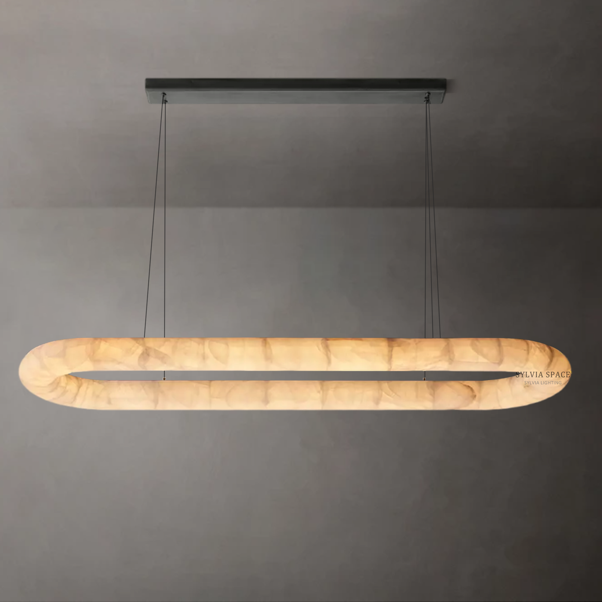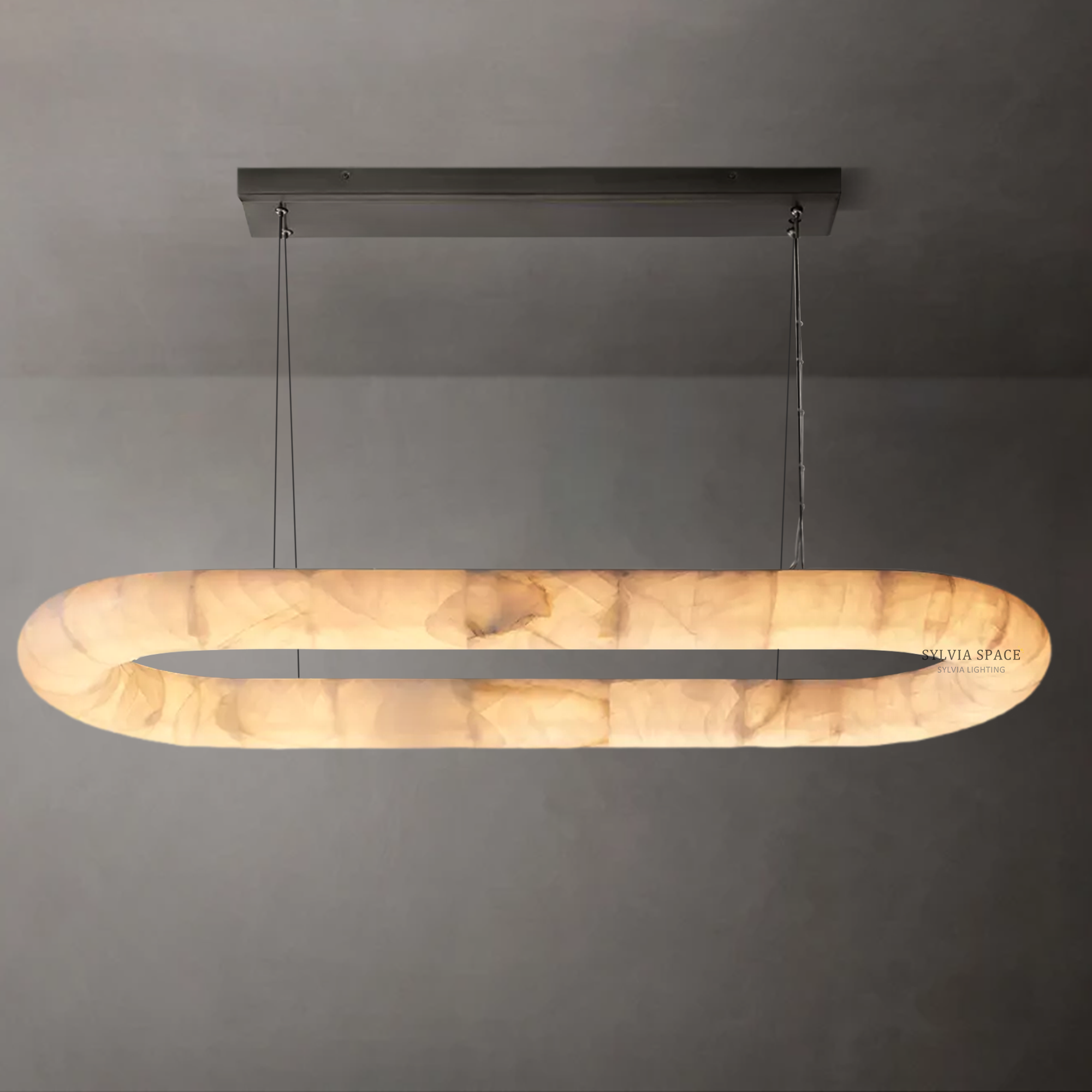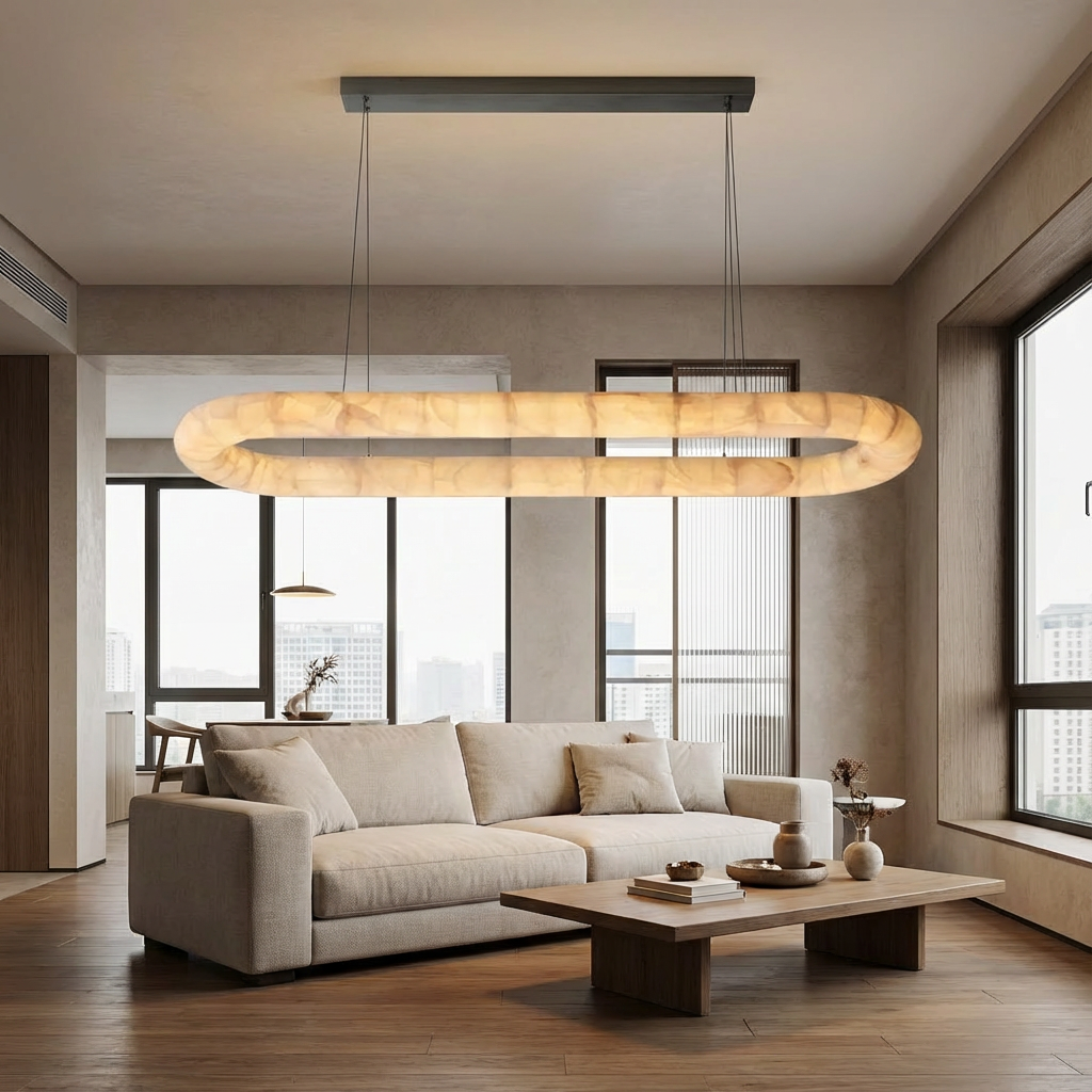 Introducing the Rivager Lisse Oval Chandelier 57, crafted in luminous alabaster to create a softly radiant focal point. Light pools at the center of the stone and gently spreads outward in delicate tonal shifts, accentuating alabaster's natural depth and warmth. Once illuminated, the alabaster reveals feathered marbling that brings a sense of intimacy and quiet luxury to any space. Its serene glow is especially suited to reading corners, warm transitional zones, and interiors that celebrate tactile, natural materials.