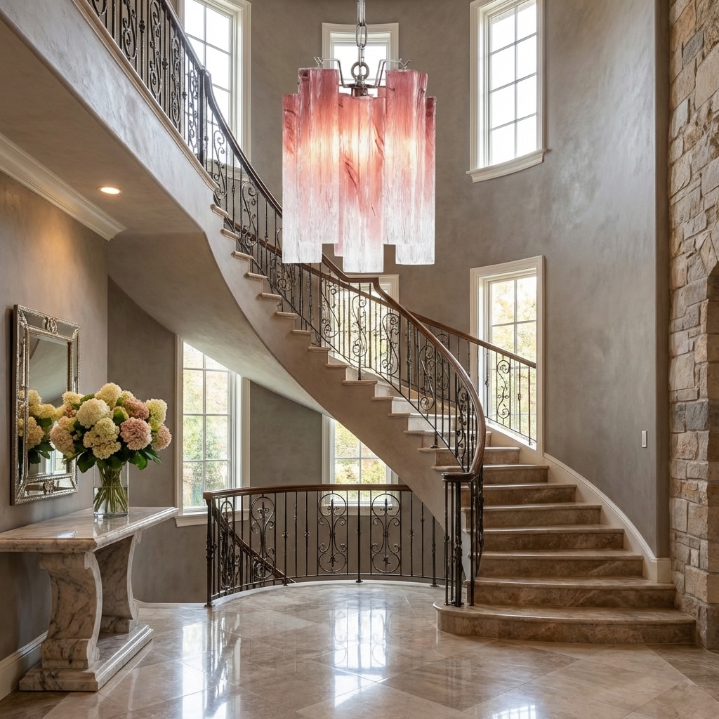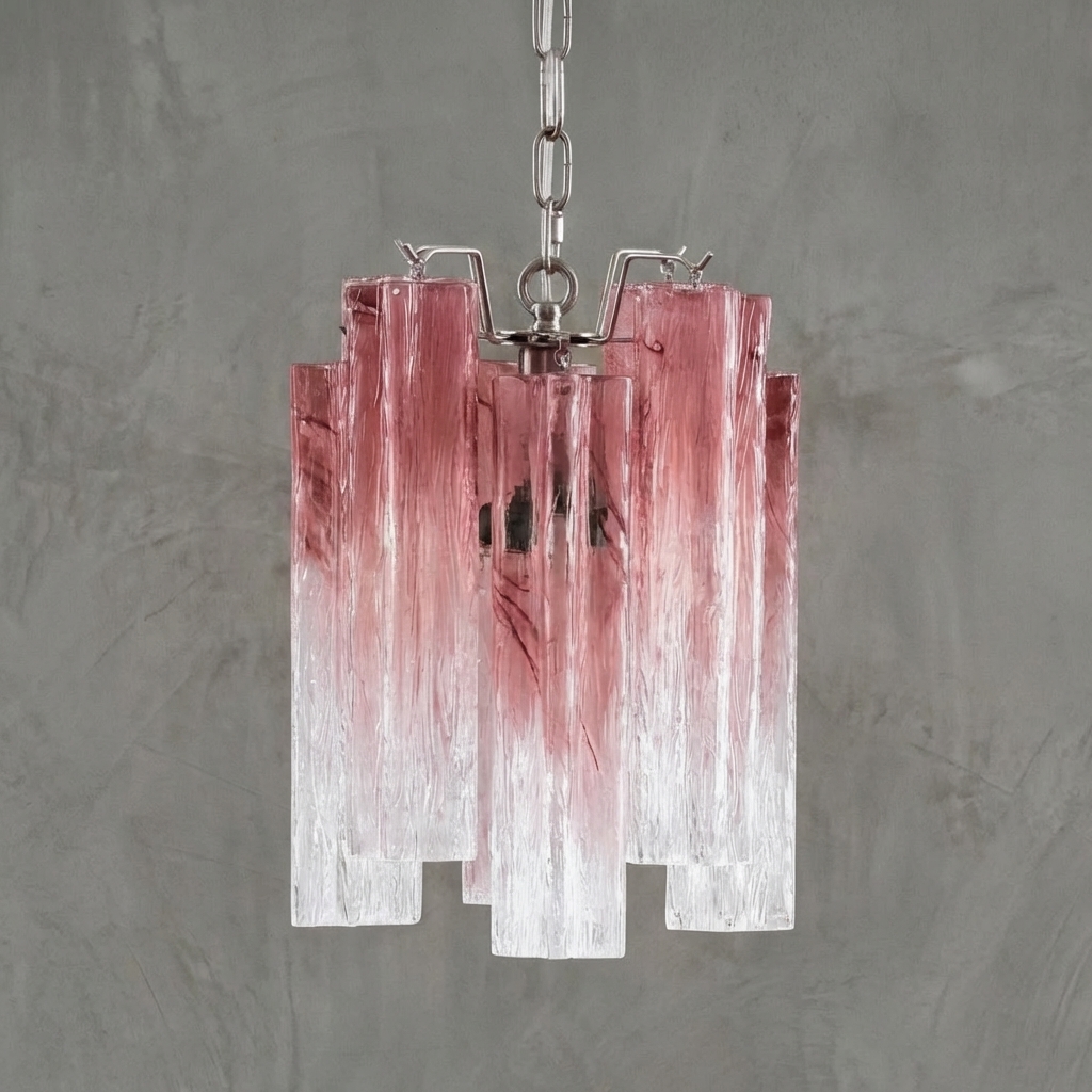 The Rosa Scala Murano Glass Chandelier brings layered elegance to compact interiors with its tiered cascade of rose-tinted Murano glass slabs. Inspired by artisanal Venetian lighting, this petite statement chandelier combines a soft pink glow with sculptural texture, making it ideal for smaller rooms, powder rooms, dressing spaces, breakfast nooks, or clustered installations.
