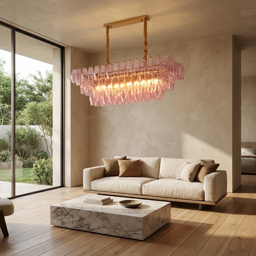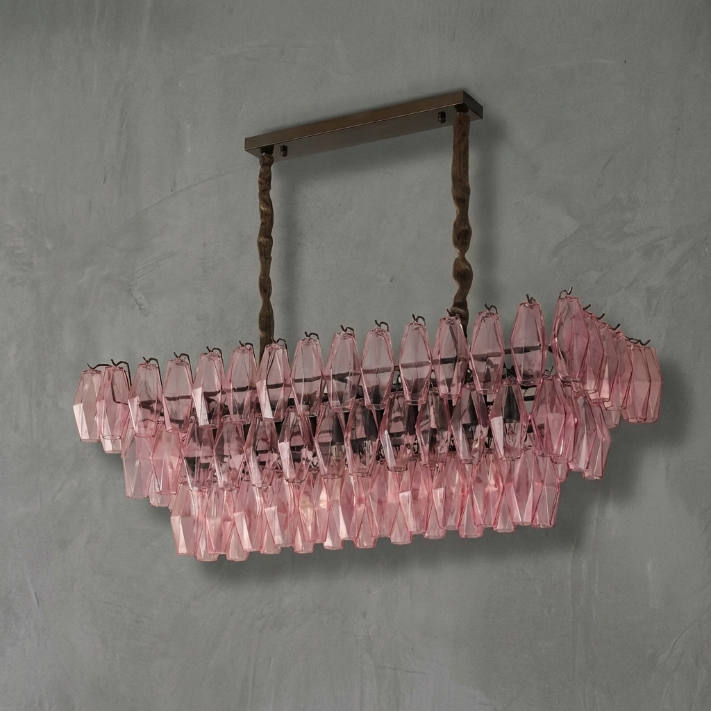 The Rosa Veneta Prism Glass Chandelier pairs Venetian-inspired elegance with a soft blush glow, combining pink Murano-style prism glass with a refined gold-toned frame. Its tiered rectangular silhouette brings warmth, romance, and a polished statement to dining rooms, kitchen islands, and other sophisticated interiors.