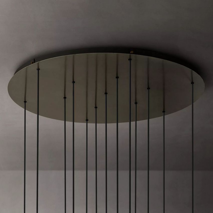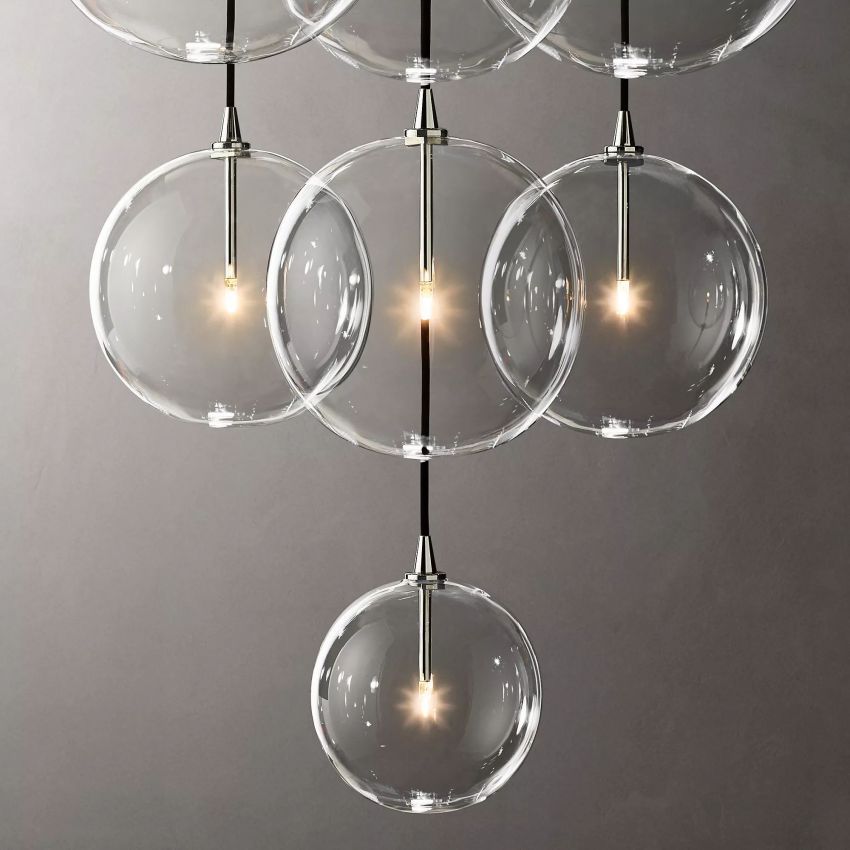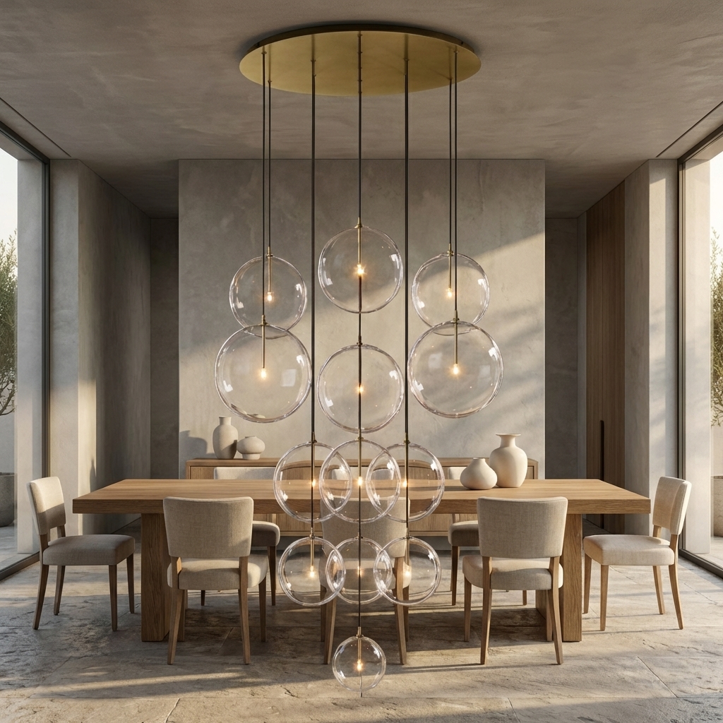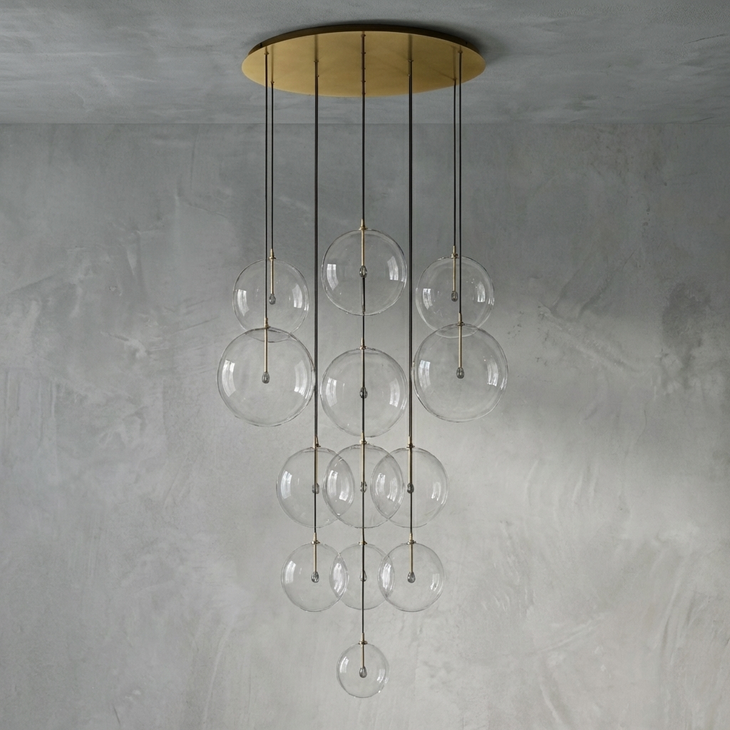 The Sfera Cluster Chandelier 44" brings a bold, sculptural presence to interiors with its modern molecular silhouette. Clear hand-blown glass bubble spheres are arranged along a geometric grid of solid brass rod arms, creating a striking balance of transparency, symmetry, and visual drama. Designed for dining rooms, living rooms, bedrooms, studies, hotels, and bars, this statement chandelier combines refined materials with architectural form.
