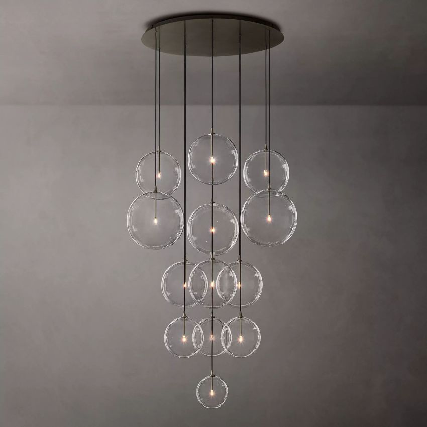 The 44½" diameter composition features thirteen illuminated globes in varied sizes for layered scale and sculptural presence: one 8" globe, three 10" globes, six 12" globes, and three 14" globes. Suspended from a substantial 36" diameter canopy, the fixture offers an adjustable installation range with a minimum overall height of 66" and a maximum height of 10'9". A 10'10" cord is included to support flexible placement in rooms with higher ceilings.