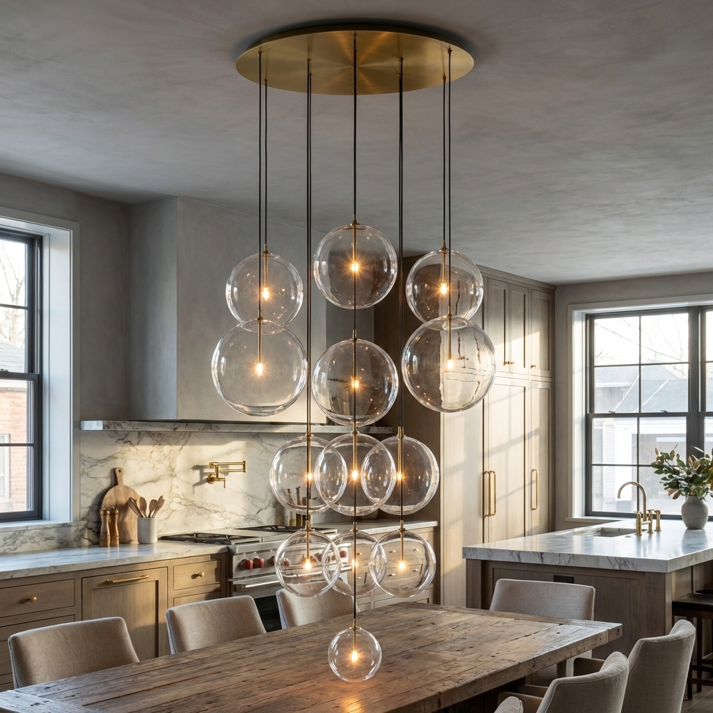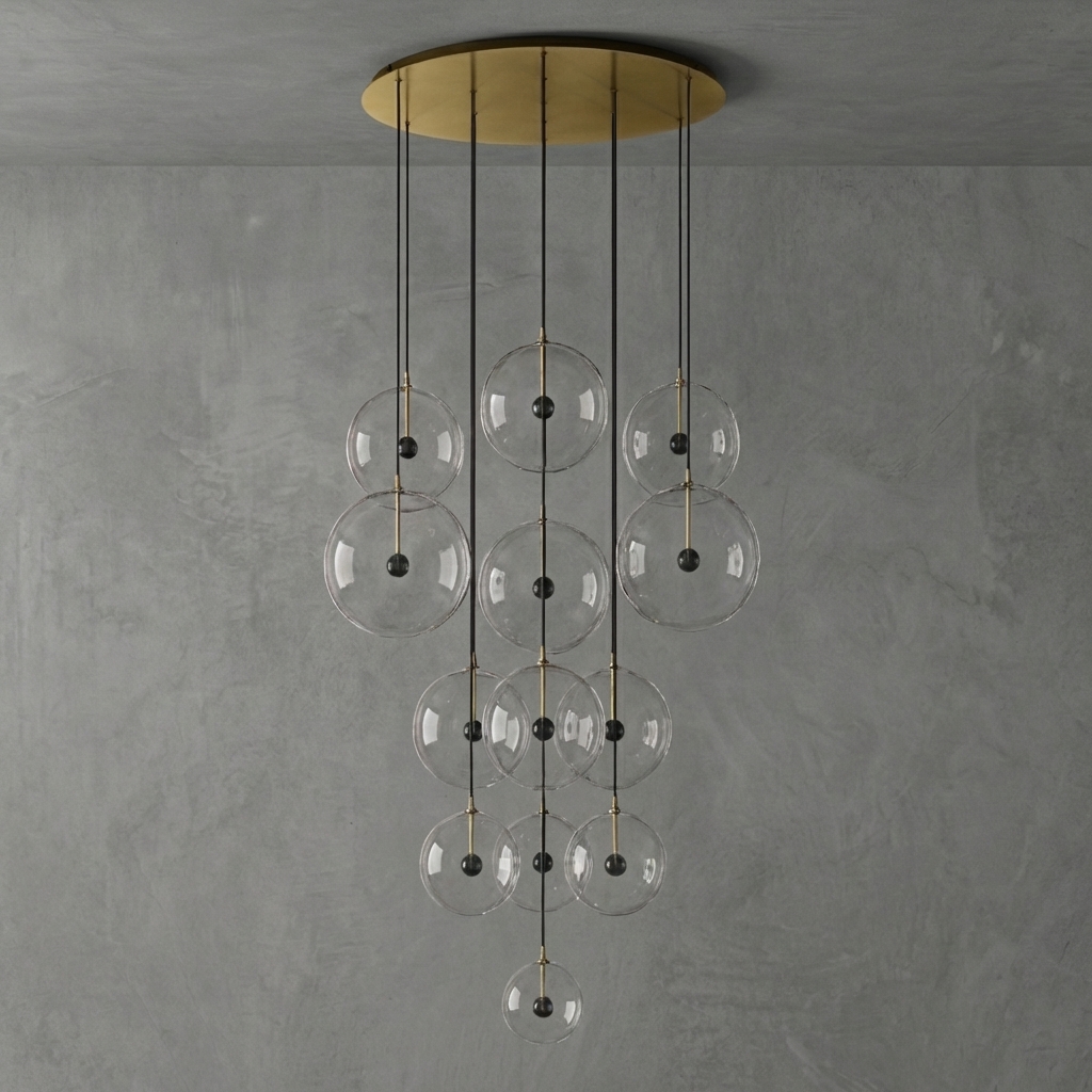 Sfera Cluster Chandelier 44" brings a modern molecular silhouette to large interiors with a striking grid of clear glass bubble spheres extending from clean-lined metal arms. Balancing geometric structure with airy transparency, this statement chandelier is crafted from solid brass and hand-blown glass for a refined look in dining rooms, living rooms, bedrooms, studies, hotels, and bars.