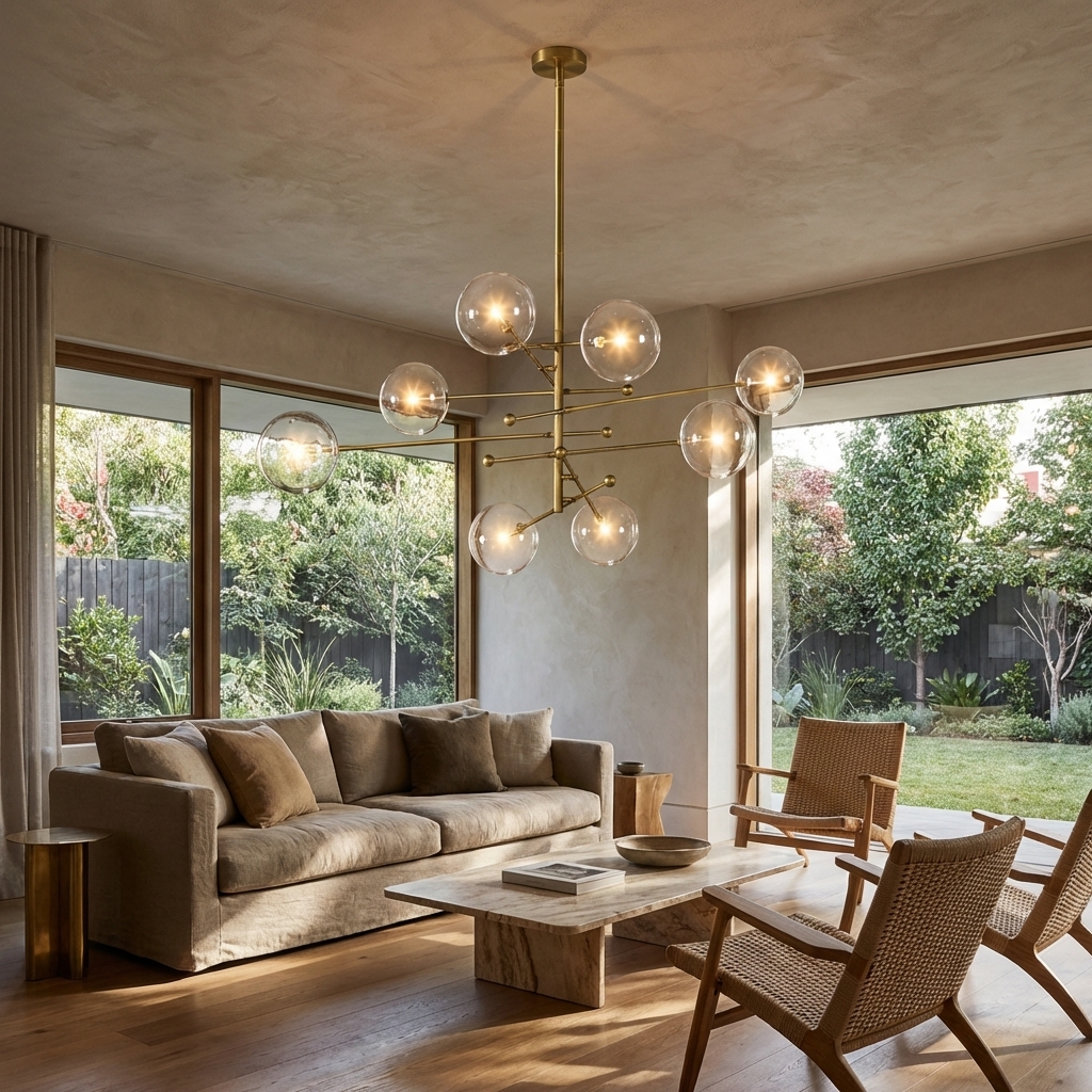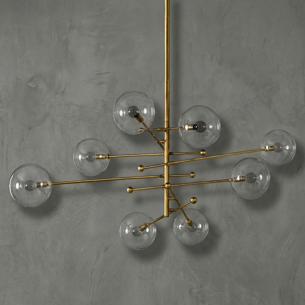 The Sfera Eight-Arm Chandelier 79"W brings a bold, architectural presence to modern interiors with its geometric grid of slender rod arms and luminous clear glass bubble spheres. Inspired by molecular forms, this statement chandelier combines hand-blown glass globes with solid brass construction for a refined balance of softness and structure. Its wide 78½" span makes it ideal over large dining tables, in expansive living rooms, bedrooms, studies, hotels, and bar spaces.