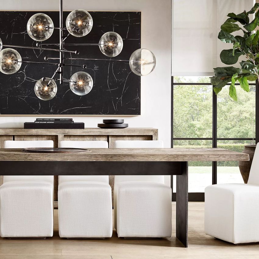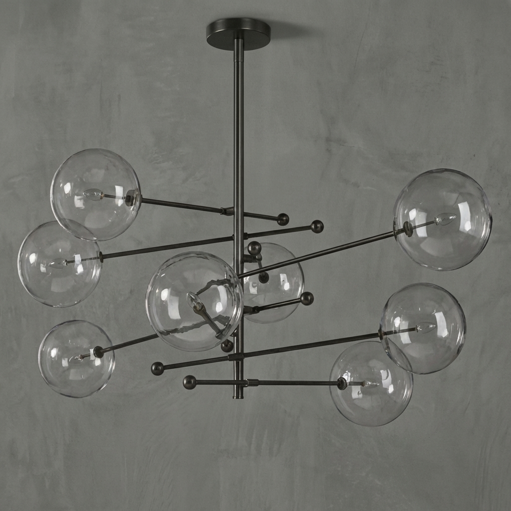 The Sfera Eight-Arm Chandelier 79"W brings a modern molecular look to large interiors with its structured grid of rod arms and clear hand-blown glass bubble globes. Crafted from solid brass and glass, this statement chandelier pairs geometric balance with airy transparency, making it ideal for dining rooms, living rooms, bedrooms, studies, hotels, and bars.