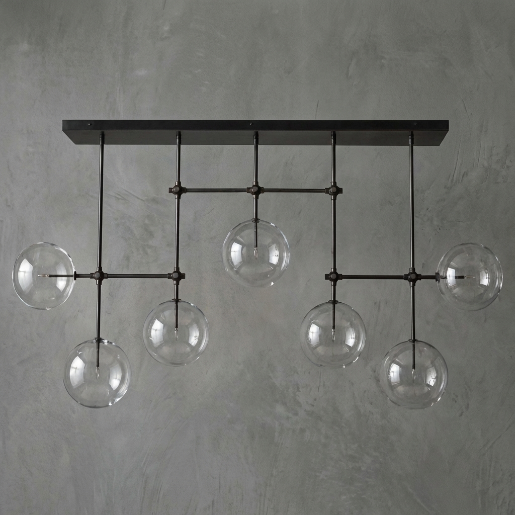 Sfera Linear Chandelier 59"W brings a modern molecular look to interiors with a structured linear frame, clear hand-blown glass bubble globes, and mixed black/brass detailing. Its geometric silhouette makes it an ideal statement fixture for dining rooms, living rooms, bedrooms, studies, hotels, and bars.