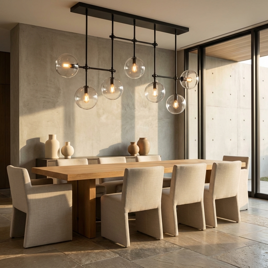 The combination of luminous clear globes and a bold linear framework gives the Sfera Linear Chandelier 59"W a refined contemporary presence while maintaining a sculptural, airy feel. Adjustable rods allow installation across a range of ceiling heights, making it suitable above dining tables, kitchen islands, and long feature spaces.