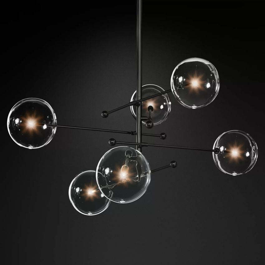 The Sfera Six-Arm Chandelier 55"W brings a clean, architectural take on the modern molecular chandelier. Six clear hand-blown glass bubble globes extend from a structured grid of black and brass rod arms, creating a bold geometric silhouette with airy transparency. Its balanced composition makes it an ideal statement fixture above a dining table, in a living room, bedroom, study, hotel, or bar.