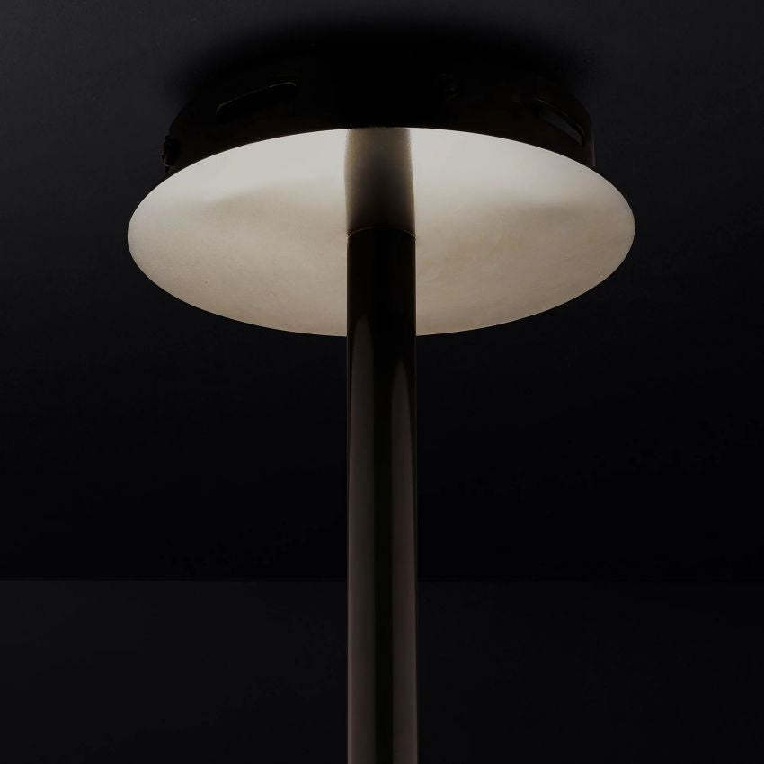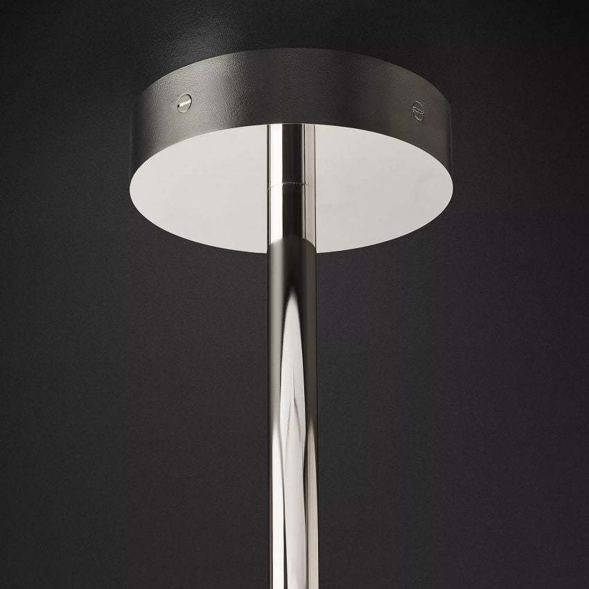 Crafted from solid brass and hand-blown glass, this chandelier pairs refined materials with contemporary contrast. The fixture is available in Lacquered Burnished Brass, Matte Black, or Polished Nickel finishes, allowing it to suit a range of interiors from modern to transitional.