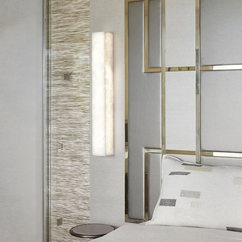 This Wall Light, made with metal and alabaster, showcases a sleek design suitable for various interior styles. Whether installed singularly as a standout focus or grouped for a unified lighting setup, its shape brings a modern and sophisticated touch, enhancing the space with a refined aesthetic.
