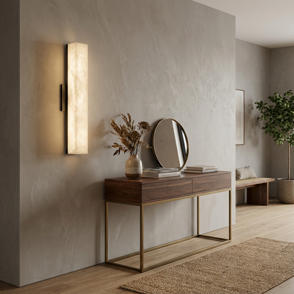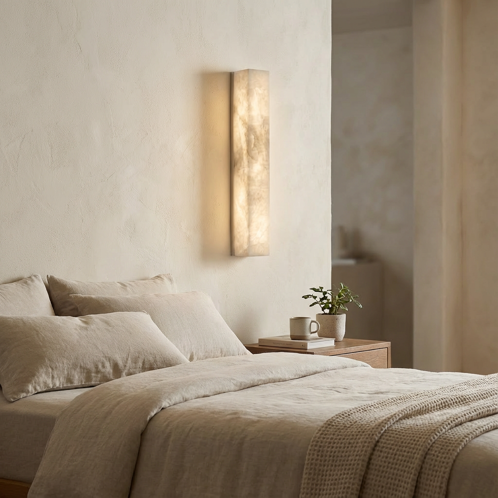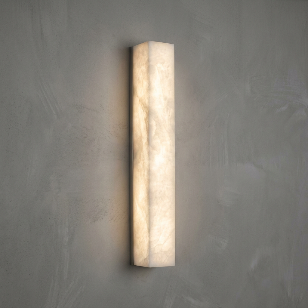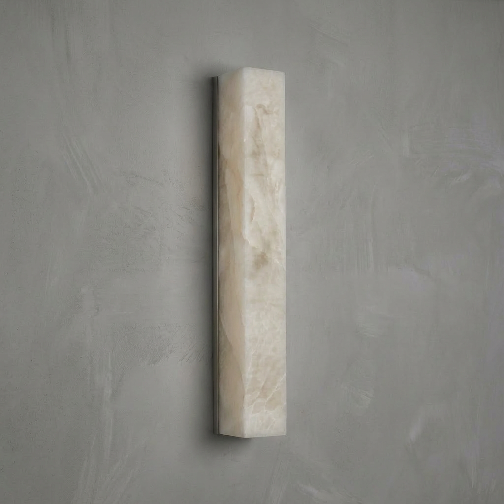Introducing the Sheta Alabaster Wall Light Series, where warm ivory and pale amber tones come to life as the light gently brightens. The natural translucence of the alabaster creates a serene, grounded illumination that feels both calming and refined. With a silhouette that remains understated, the design lets the naturally luminous alabaster surface take center stage. Its balanced presence is ideal for living rooms, bedrooms, and softly curved architectural spaces that benefit from a gentle glow rather than direct brightness. Elegant and quietly expressive, this wall light adds a layer of warmth and atmosphere, enhancing the room without overpowering it.
