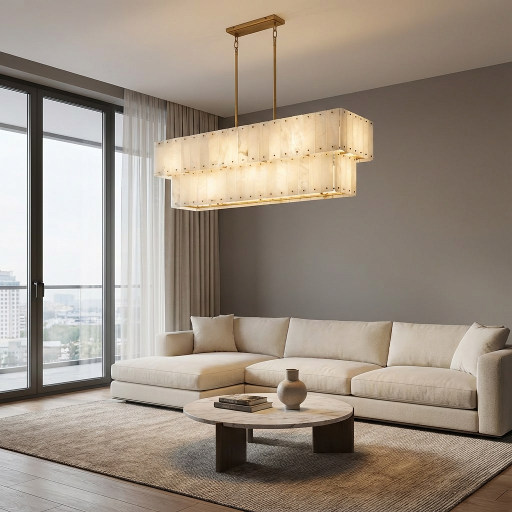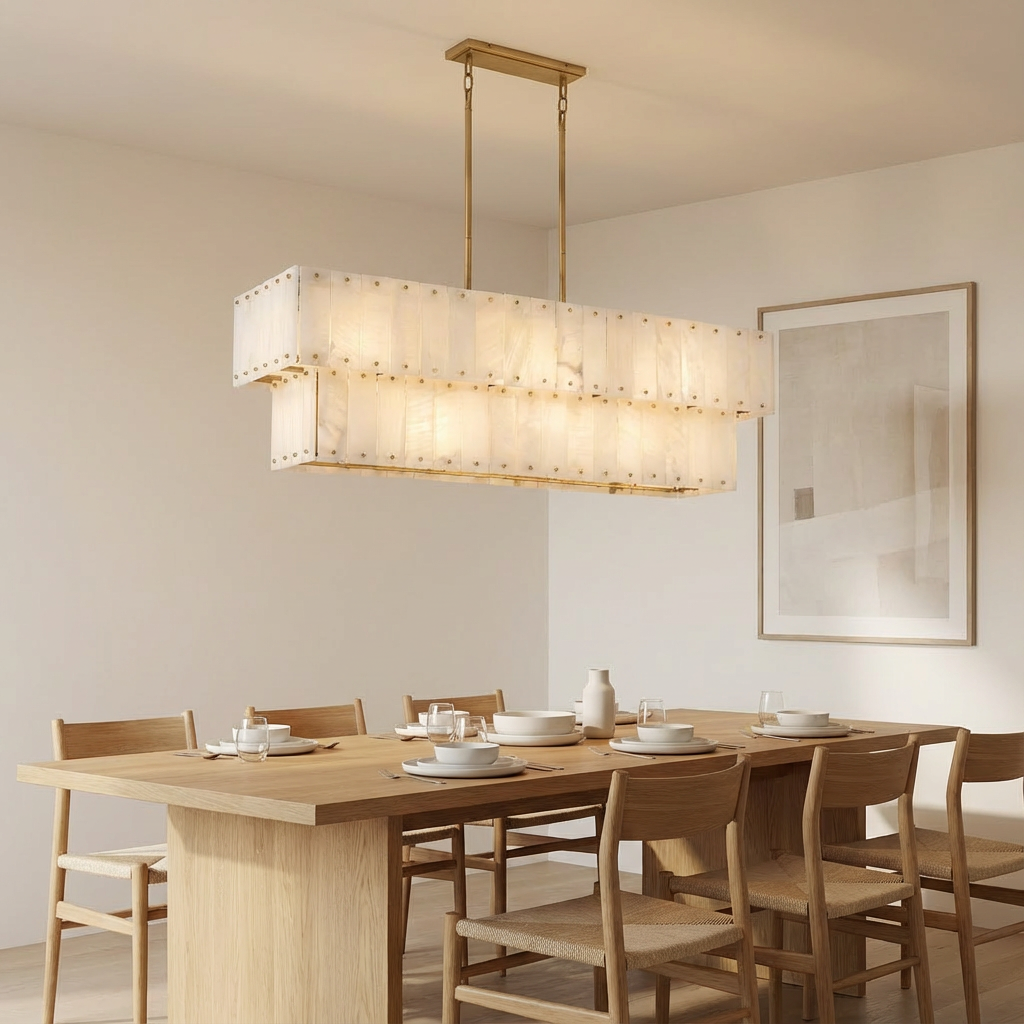 Introducing the Simone Alabaster Linear 2 Tier Chandelier - a study in calm, sculptural simplicity. Soft, halo-like illumination glows across the alabaster, revealing mineral patterns in subtle, shifting layers that bring a sense of quiet luxury to any space. Crafted to enhance interiors that value atmosphere and refined form, this chandelier creates a warm, inviting depth without overpowering the room. The natural character of the alabaster takes center stage, adding texture and visual interest even when the light is off. Ideal for dining areas, intimate lounge settings, and architectural pathways, the Simone Alabaster Linear 2 Tier Chandelier contributes to a gentle, natural rhythm of light. Its linear, layered silhouette feels both modern and timeless, seamlessly complementing contemporary and minimalist interiors alike.