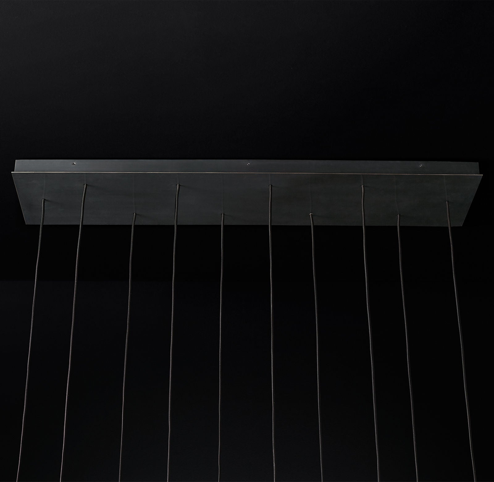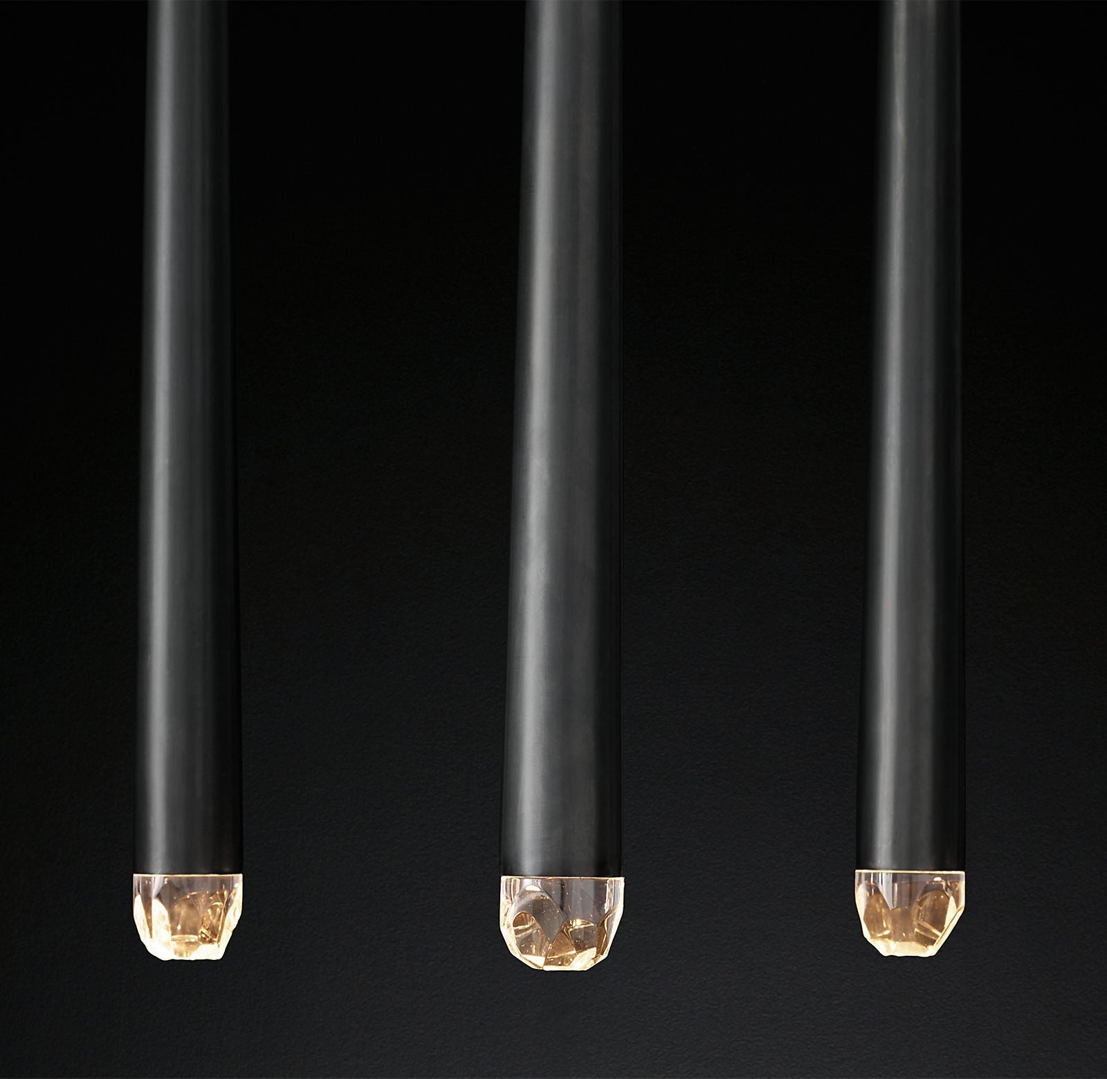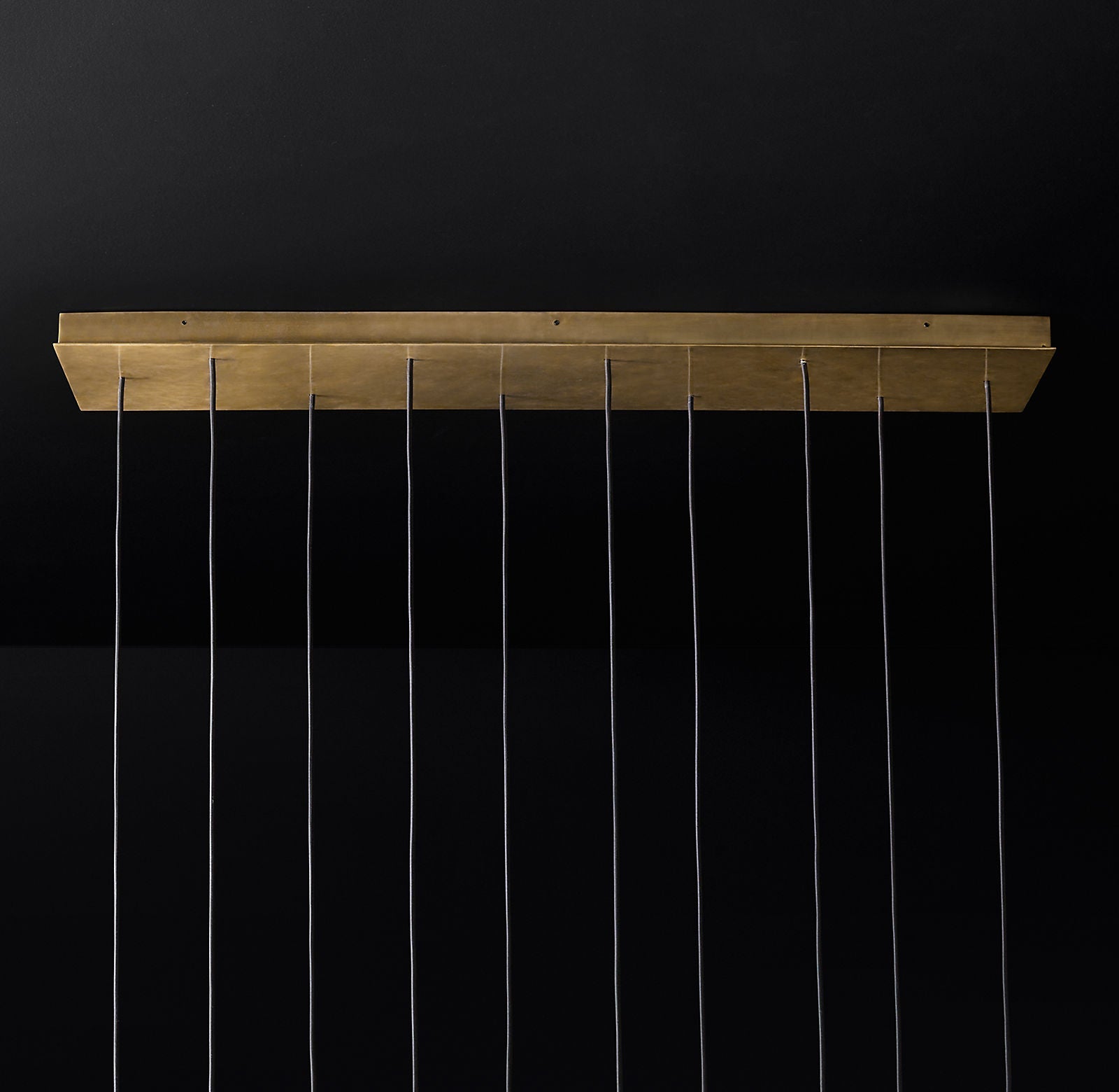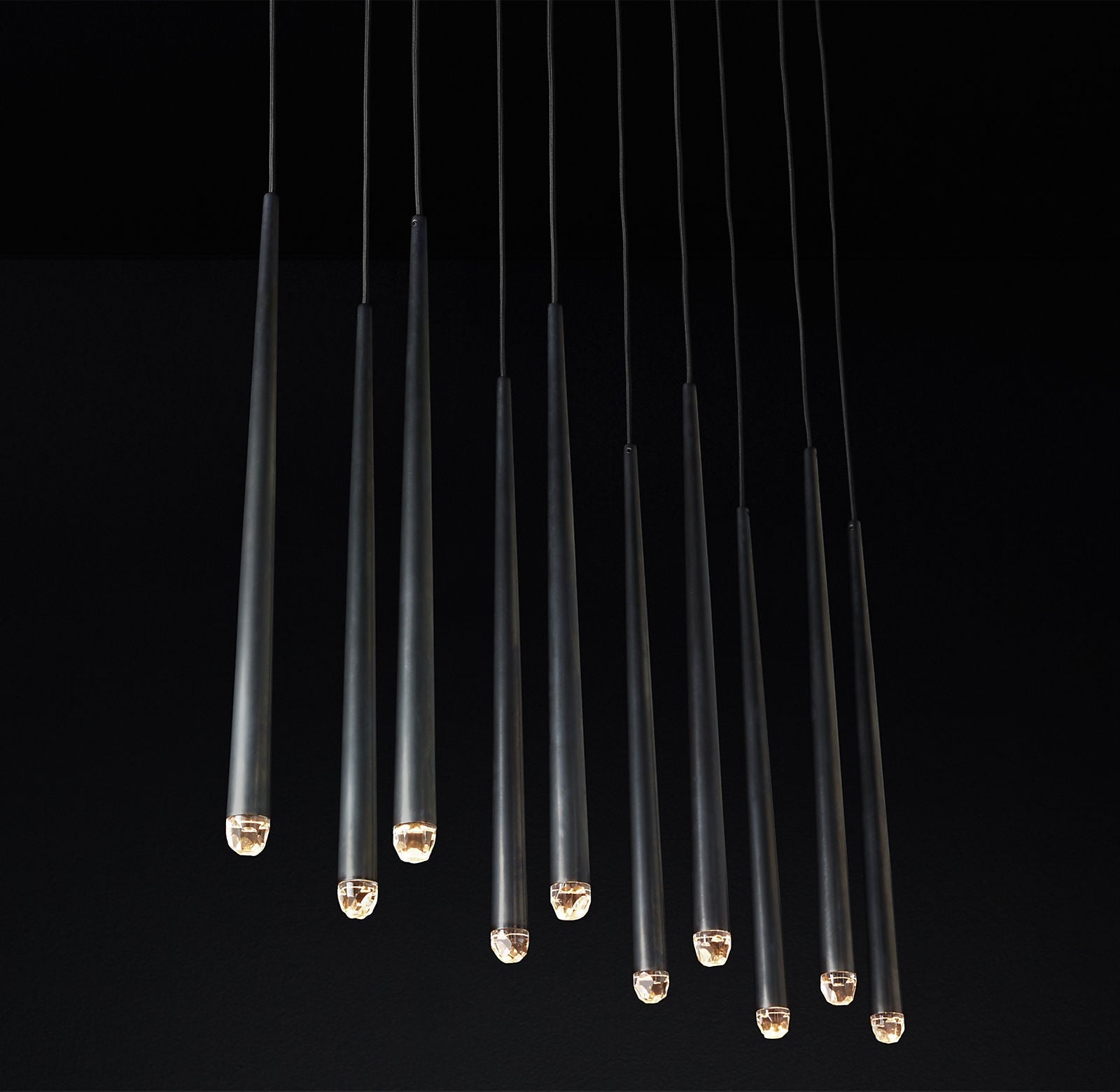 Crafted from solid brass and faceted glass, the Stellara is available in Lacquered Burnished Brass or Bronze. Its elongated frame measures 48"W, with an overall maximum height of 60". The brass form itself measures 24.5"H, while the rectangular canopy measures 48"W x 11"D x 1.75"H for a streamlined ceiling profile.