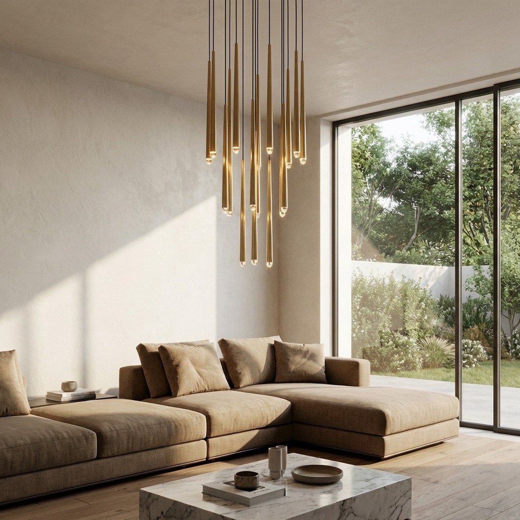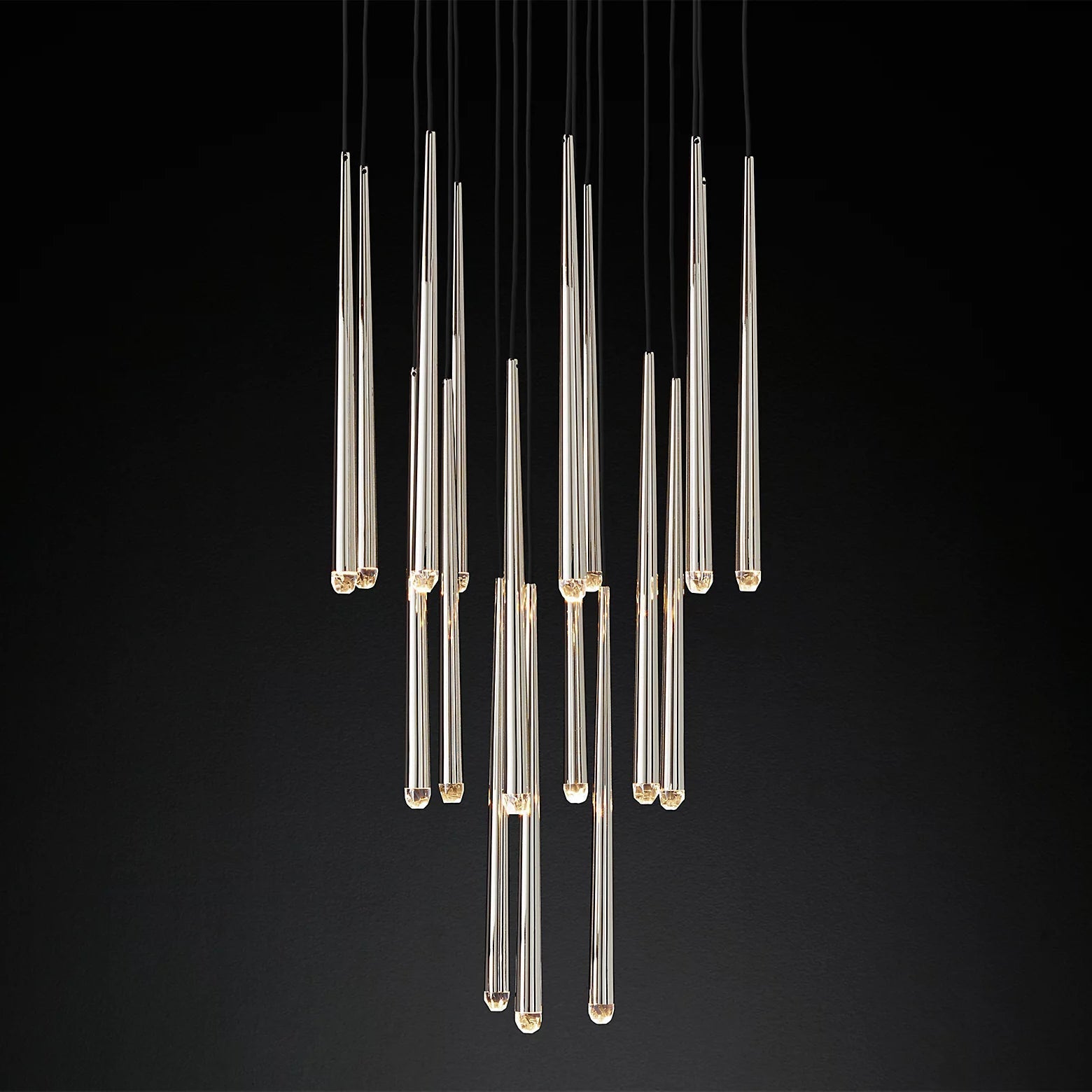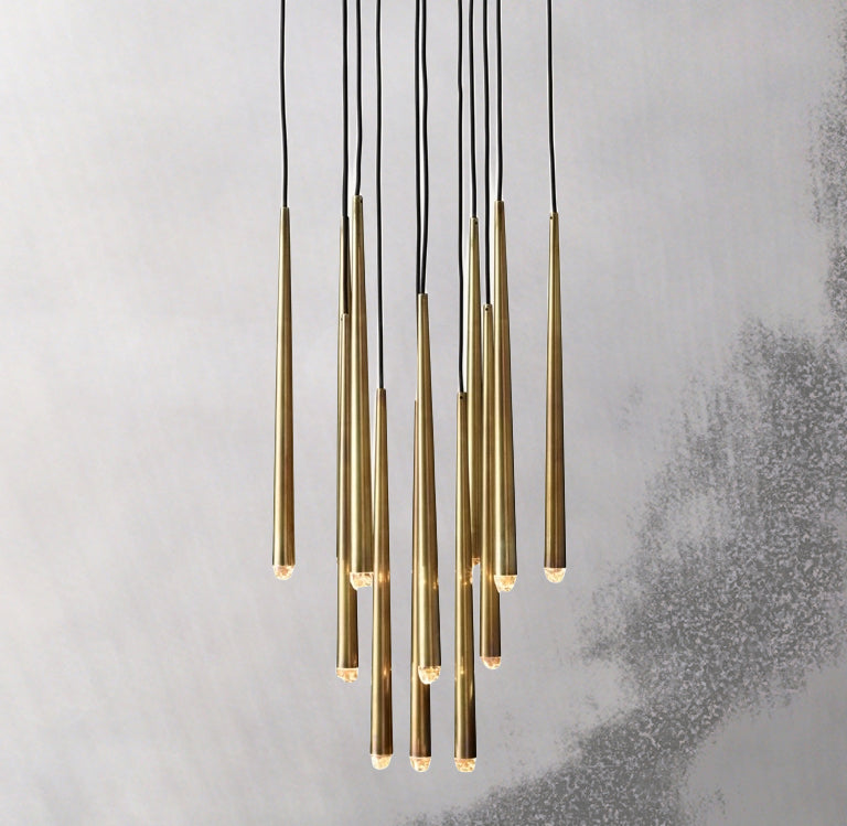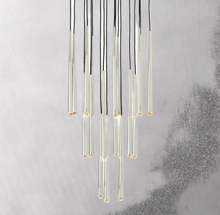 The Stellara Round Chandelier 30" brings a refined architectural presence to any interior with its slim tapered brass rods and faceted crystal points arranged in clean vertical lines. Its elongated silhouette balances minimalism and luxury, making it an ideal statement fixture for living rooms, dining rooms, bedrooms, villas, and hospitality spaces.