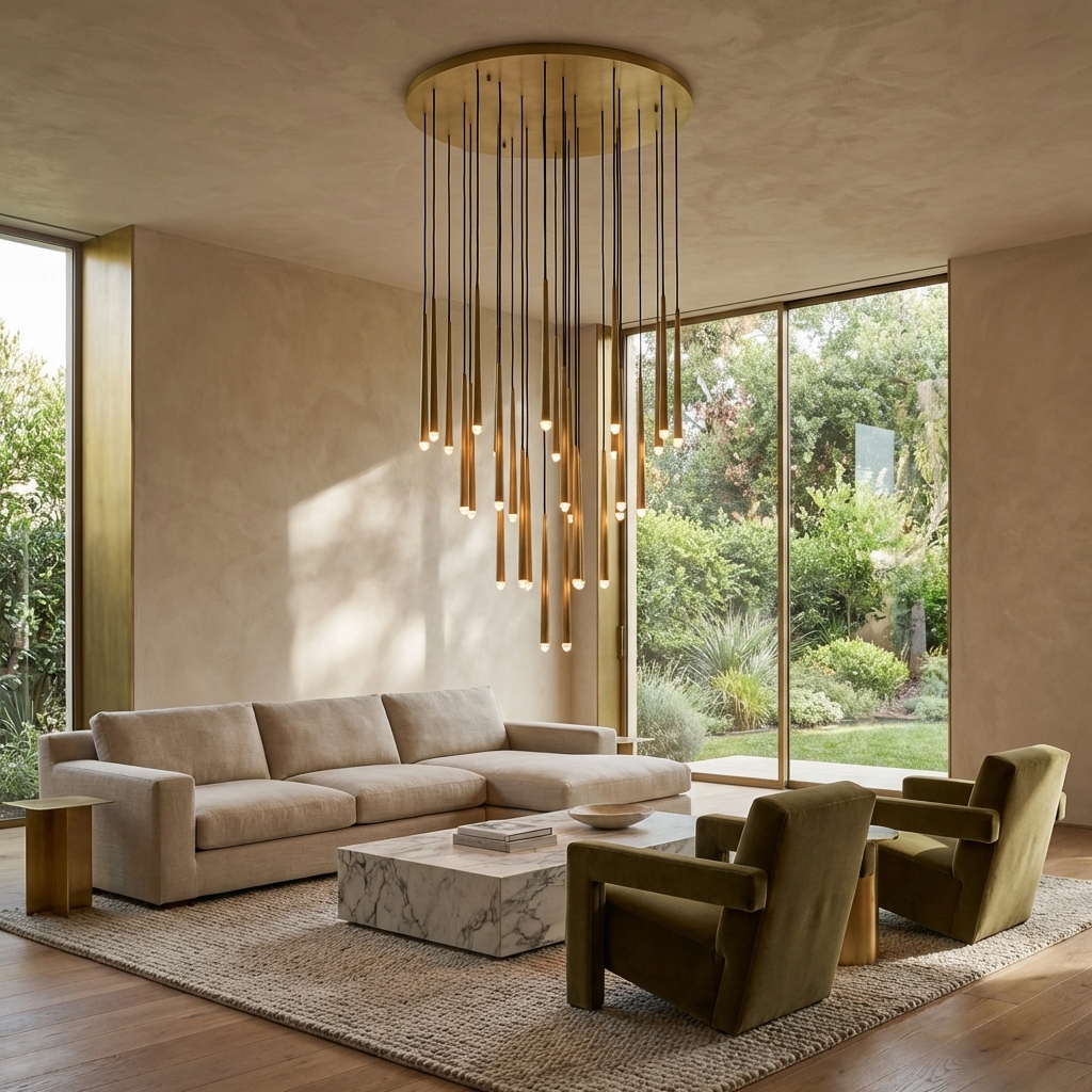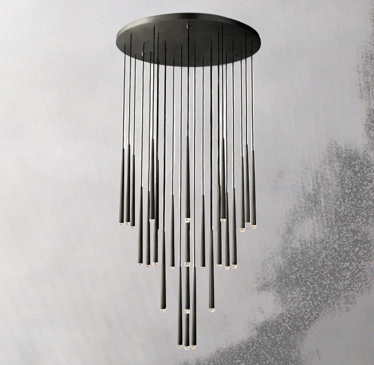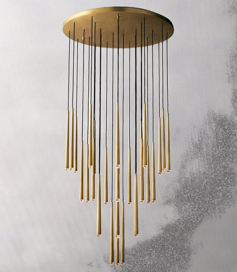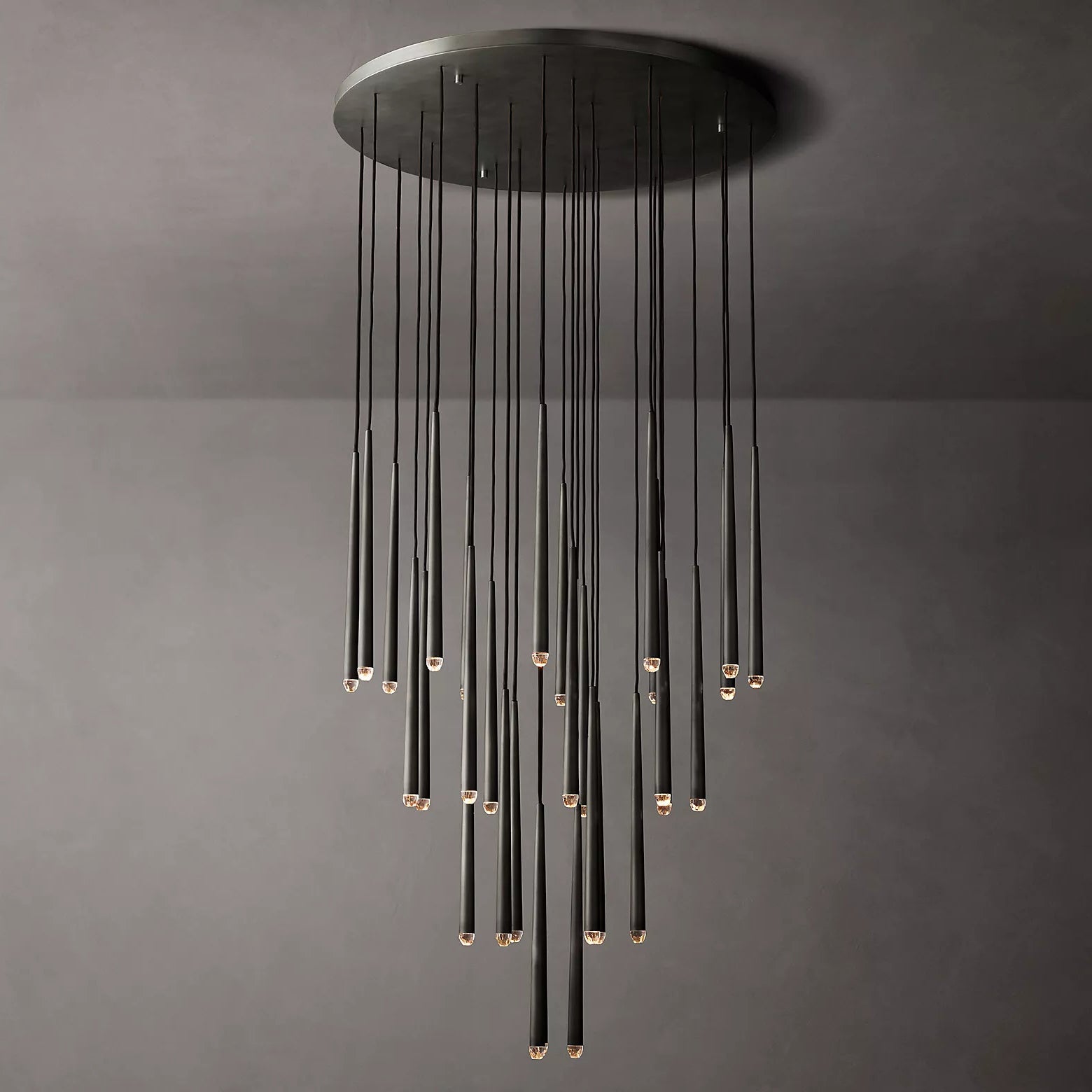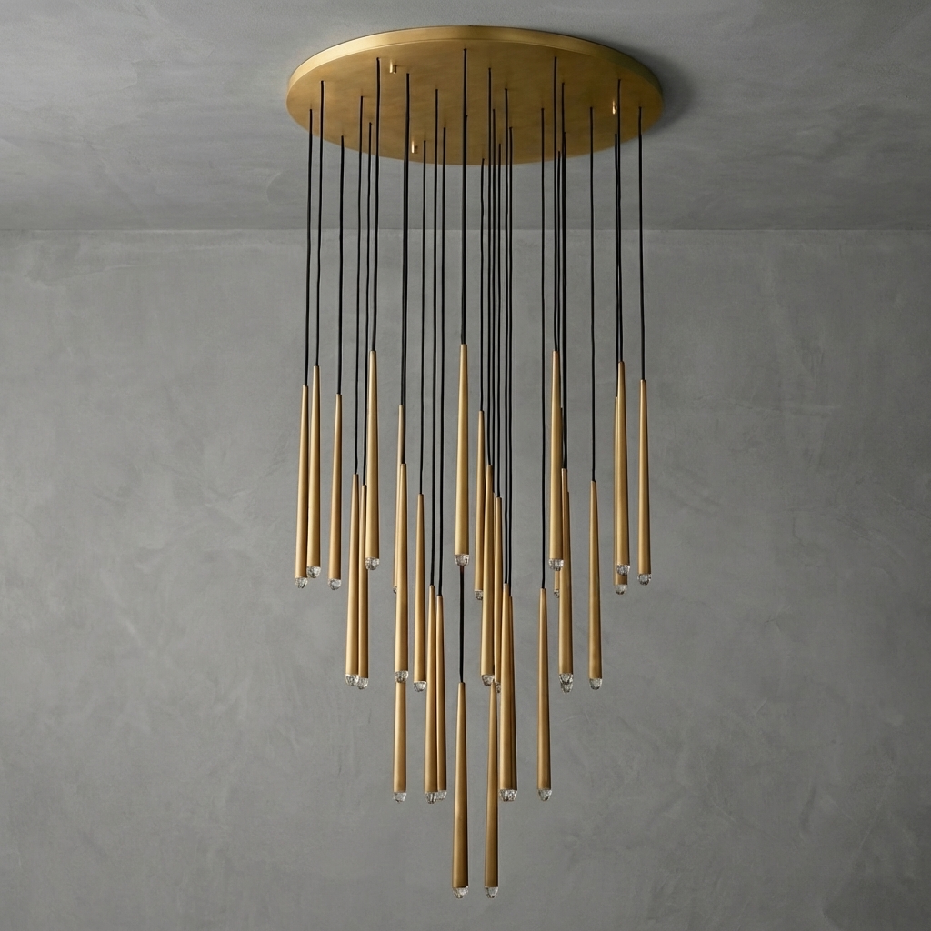The Stellara Round Chandelier 48" brings a refined architectural presence to interiors with its arrangement of slim tapered brass forms, each accented by faceted crystal points and illuminated by integrated LEDs. Suspended from a slender black cord, this dramatic round chandelier balances minimalist geometry with warm ambient light, making it an ideal statement piece for living rooms, dining rooms, entryways, and hospitality settings.