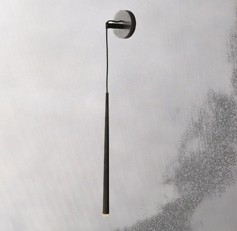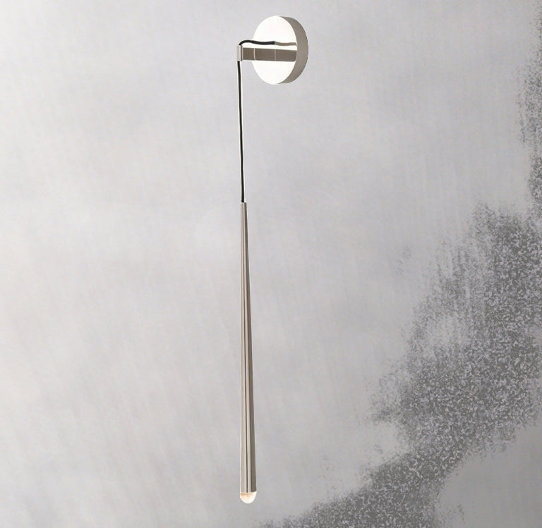 Crafted from solid brass, this wall sconce is available in Lacquered Brass, Bronze, and Polished Nickel finishes. Its minimalist vertical form measures 4½"W x 5½"D x 22¼"H, with a 4½" diameter backplate projecting 1¼" from the wall. The brass form measures 13.5"H x 1.¼"D, and the fixture weighs 4 lbs.