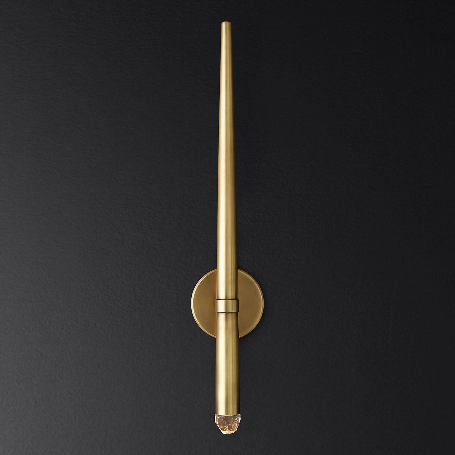 Made from brass and crystal, this handcrafted fixture pairs warm metallic structure with clear crystal accents for a balanced look of luxury and restraint. Its narrow tapered form makes it especially well suited for flanking mirrors, highlighting hallways, or adding vertical emphasis beside beds, fireplaces, and entry features.