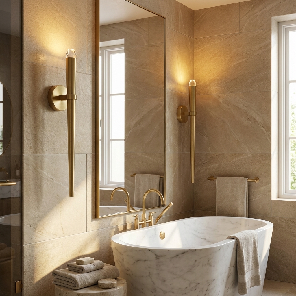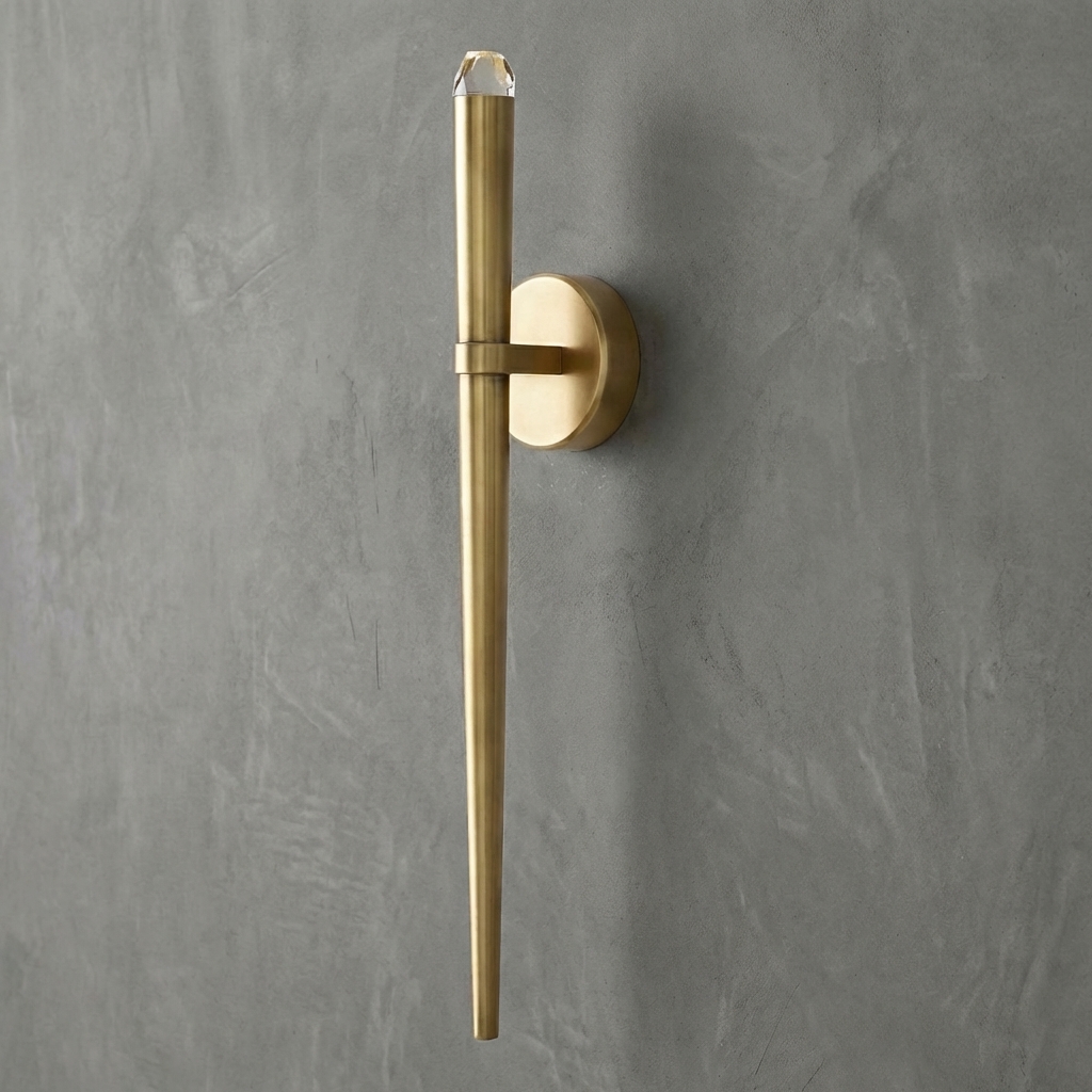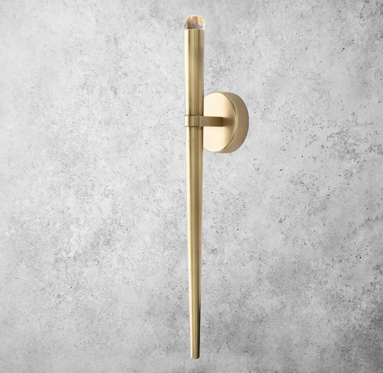 The Stellara Tapered Tubular Slender Torch Wall Sconce brings a refined architectural presence to interiors with its slim vertical profile, handcrafted brass construction, and crystal-tipped detailing. Designed to feel clean, elongated, and minimalist, this wall sconce offers an elegant torch-inspired silhouette that works beautifully in living rooms, dining rooms, bedrooms, villas, and hospitality spaces.