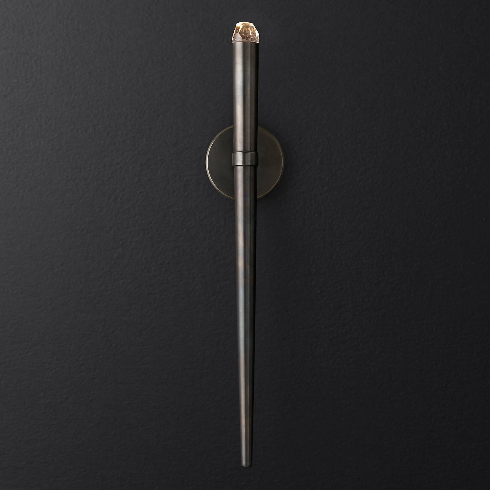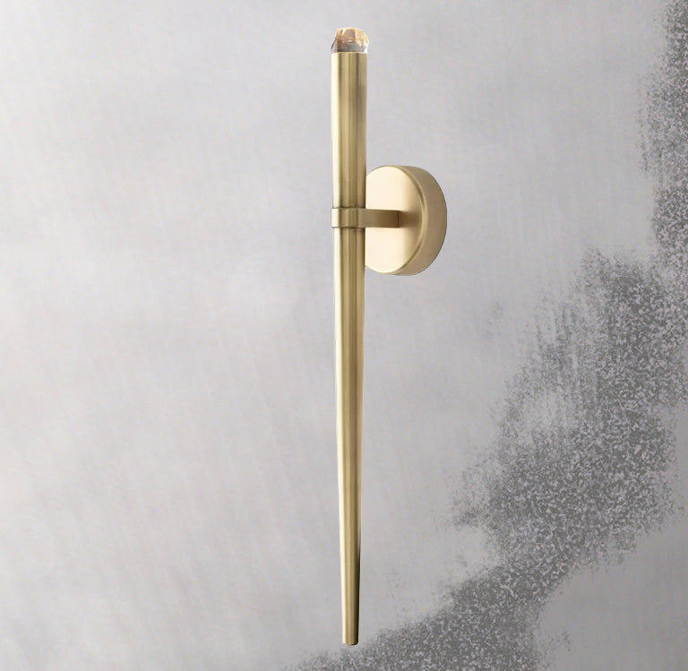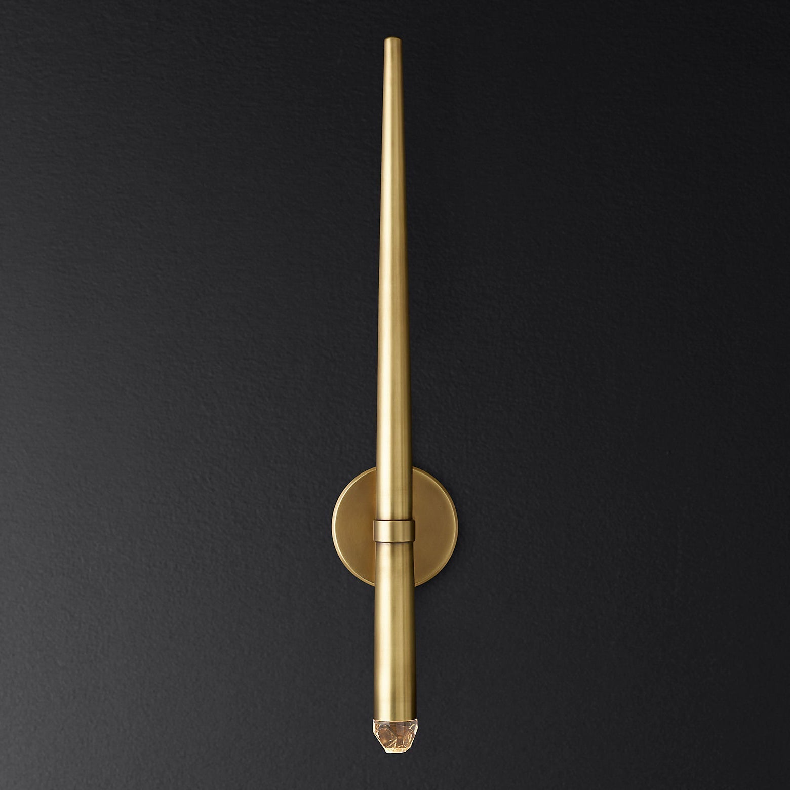 The Stellara Torch Wall Sconce 24" brings a refined architectural presence to the wall with its slim tapered brass rods and crystal-tipped detailing. Its elongated vertical silhouette creates a clean, minimalist statement while adding a warm decorative glow to bedrooms, living rooms, kitchens, restaurants, and hotel interiors.