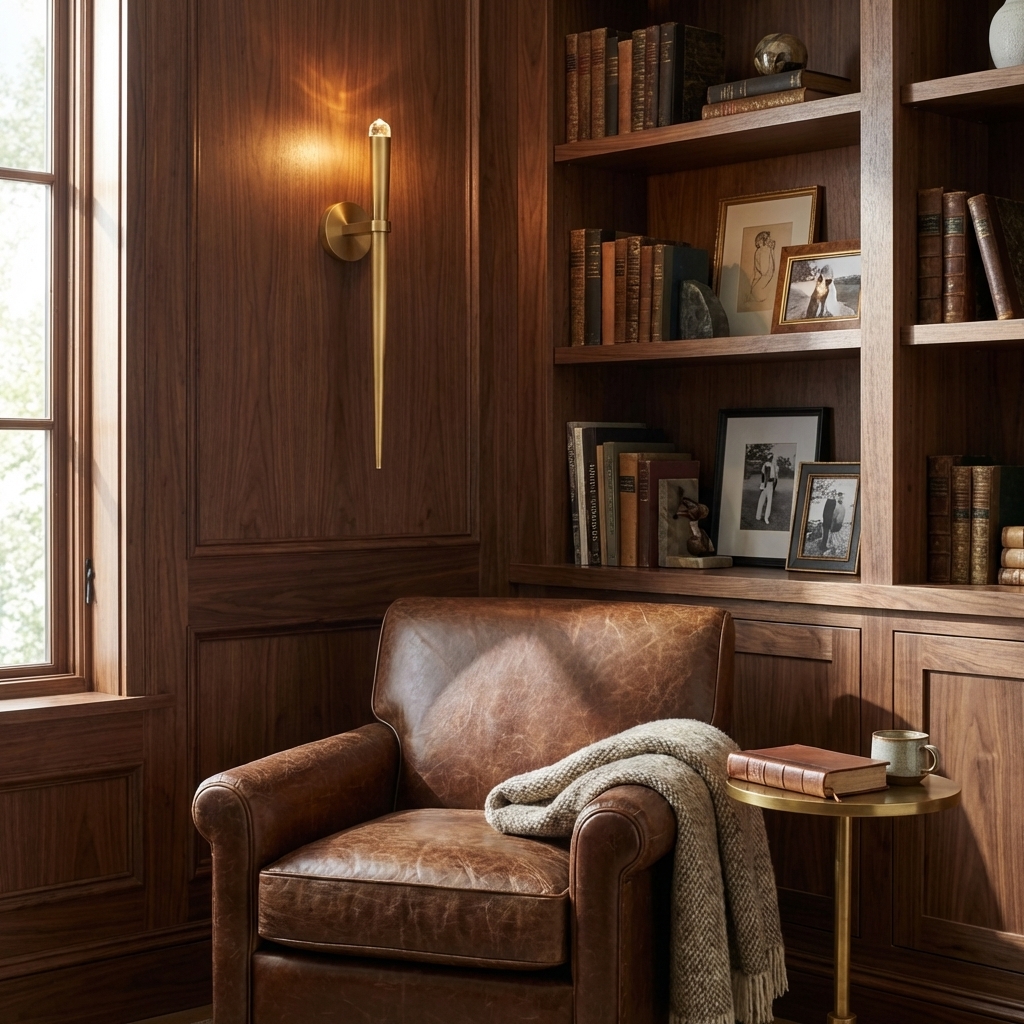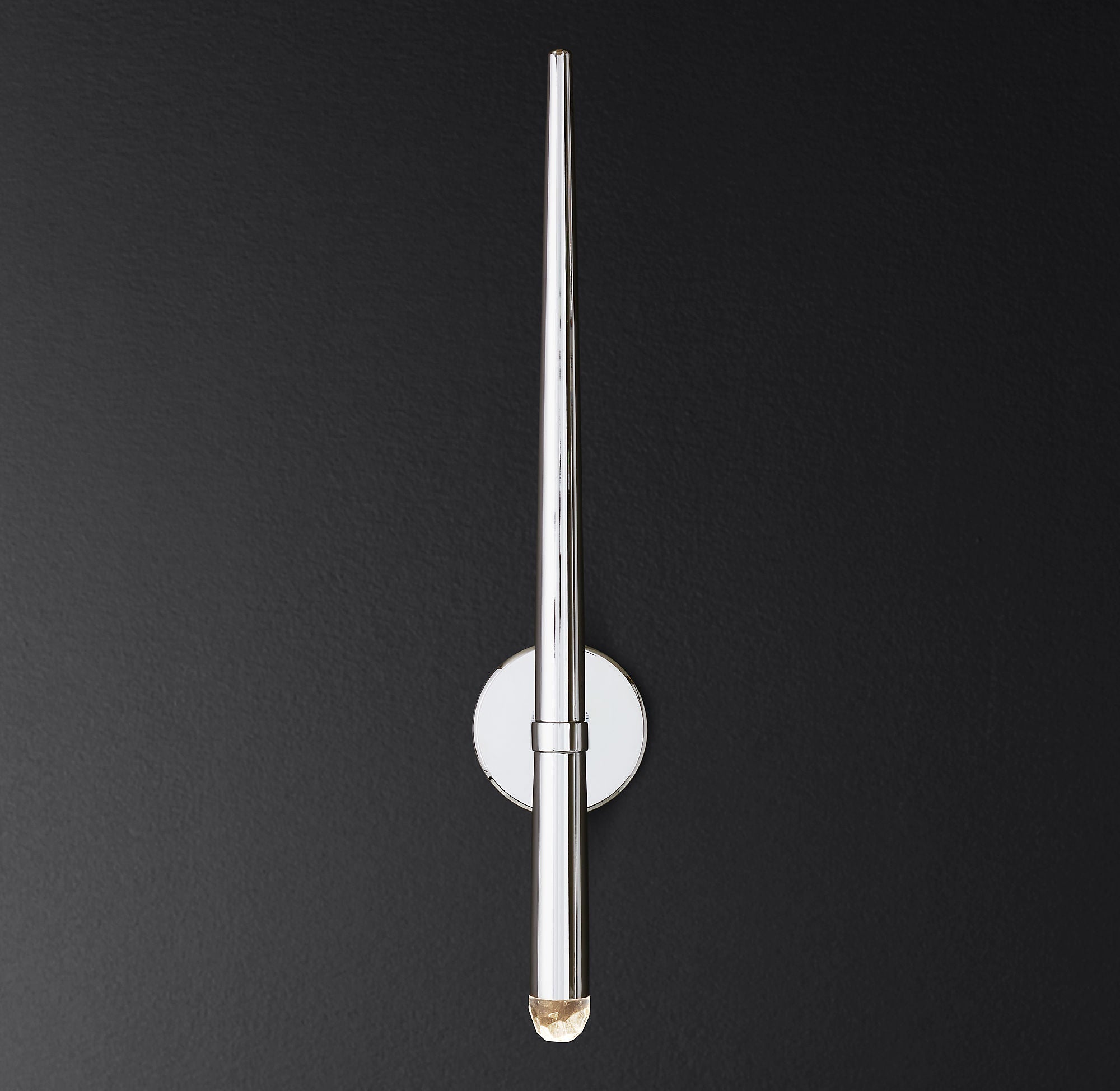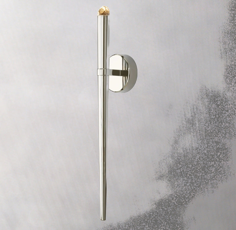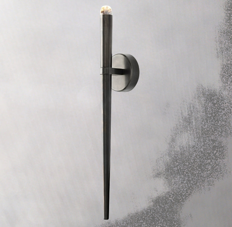 The Stellara Torch Wall Sconce 24" brings a refined architectural presence to the wall with its slim tapered brass rods and crystal-tipped detailing. Its elongated vertical silhouette creates a clean, minimalist statement while adding a warm decorative glow to bedrooms, living rooms, kitchens, restaurants, and hotel interiors.