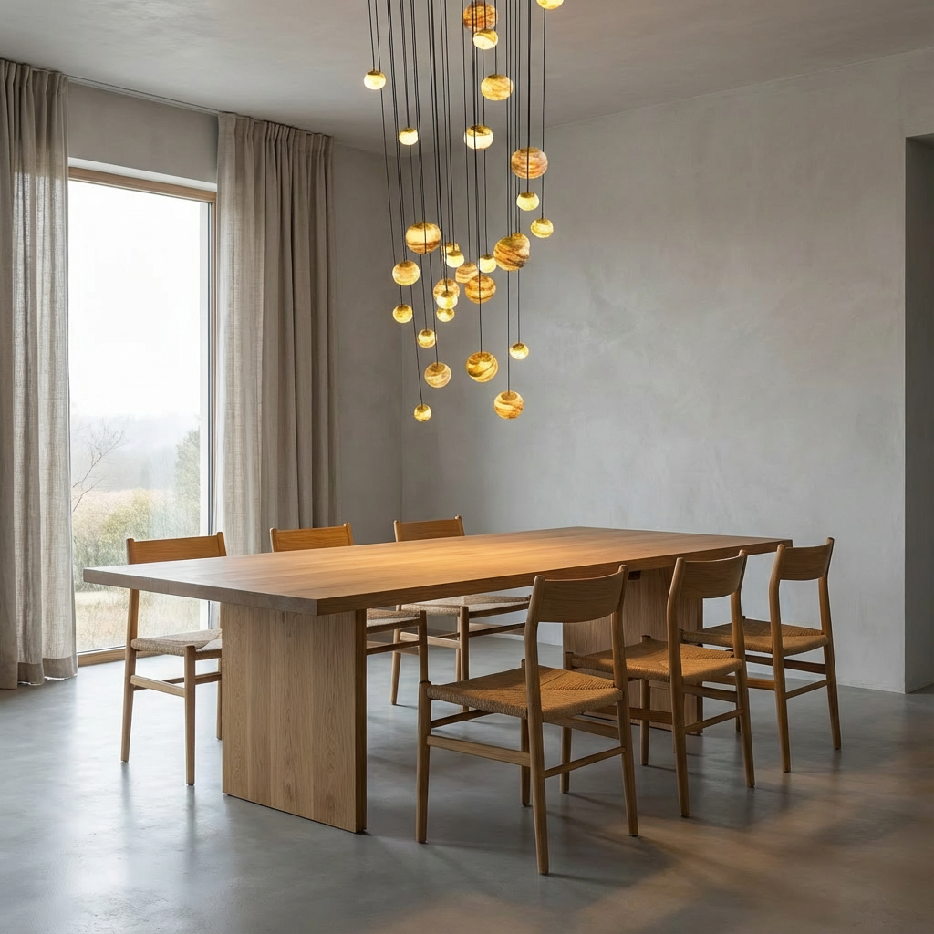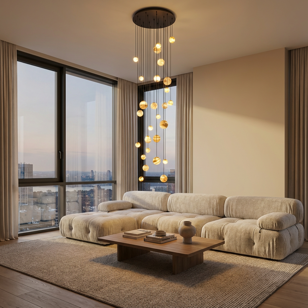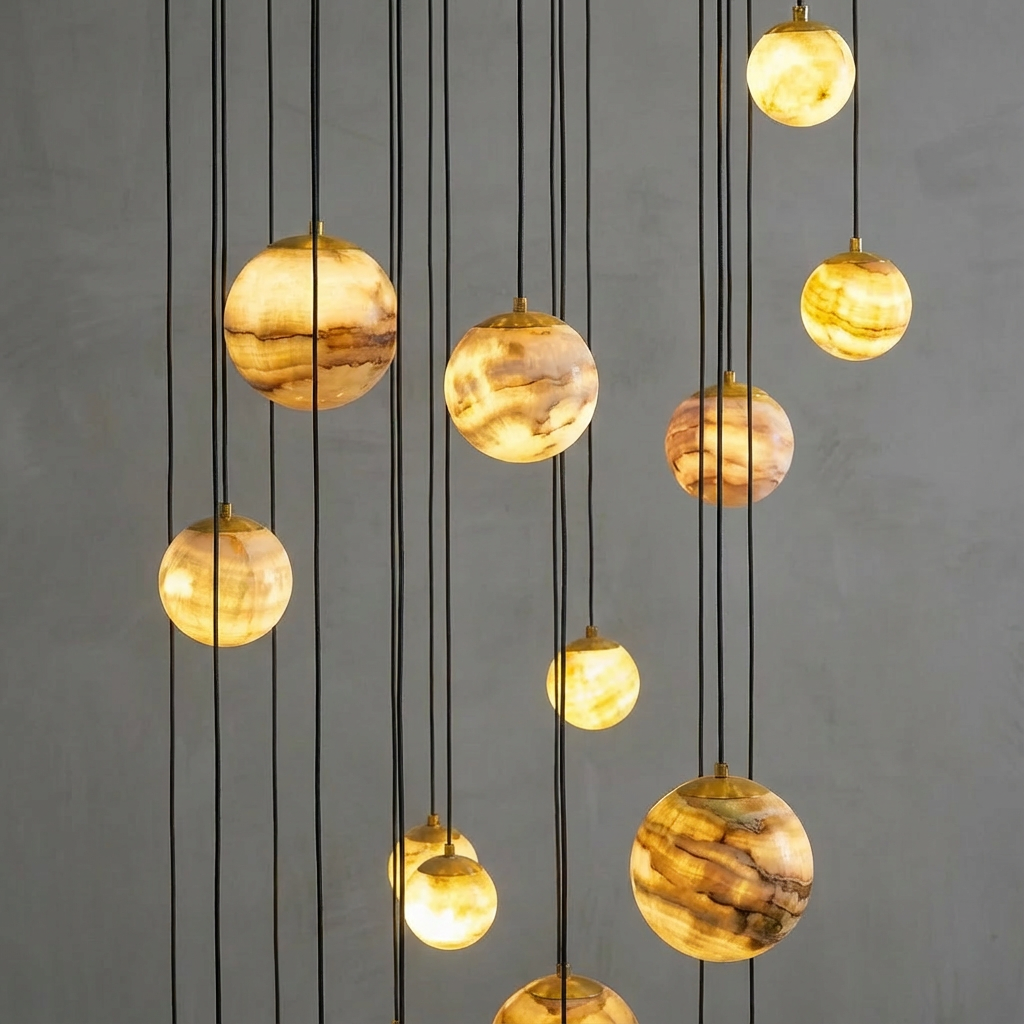 Introducing the Sultana Alabaster Cluster Chandelier Series, designed to showcase the natural depth and character of stone. When illuminated, each alabaster element reveals a layered translucency, with fine veining and clouded formations unfolding gradually to create a soft, sculptural glow. Crafted for subtle yet compelling presence, this chandelier is well-suited for hallways, niche lighting, or intimate seating areas where atmosphere matters. Its quiet detail and refined materiality allow it to blend seamlessly into contemporary, transitional, and organic-modern interiors, adding warmth and elegance without excessive ornamentation.