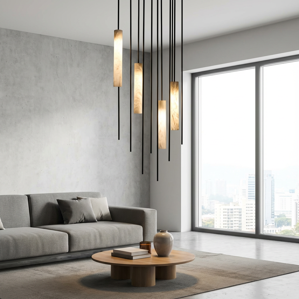 The Alabaster Sumatra V Pendant Spot Series reveals warm ivory and pale amber tones as it illuminates, casting a serene, earthbound glow. The natural alabaster becomes the focal point, gently diffusing light for a calming, atmospheric effect. With an understated silhouette, this pendant remains visually quiet, allowing the luminous stone to shine. Its balanced presence enhances living rooms, bedrooms, and softly curved architectural spaces that call for a gentle glow rather than direct, intense brightness.