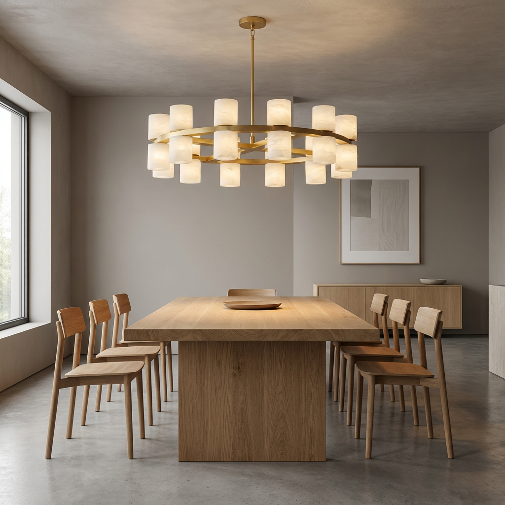 The Alabaster Tabitha Chandelier channels a soft, ambient glow through its stone diffuser, creating a presence that feels both grounded and refined. The natural beauty of alabaster takes center stage, its gentle illumination enhancing serene, modern interiors with an inviting warmth. Each alabaster component features inherent variation, giving the chandelier an organic complexity that adds visual interest and depth. This nuanced character makes it as compelling by day as it is atmospheric by night. Thoughtfully designed for versatility, the Alabaster Tabitha Chandelier works beautifully in layered lighting plans-equally suited to accent illumination or as a warm atmospheric focal point across a variety of room types.