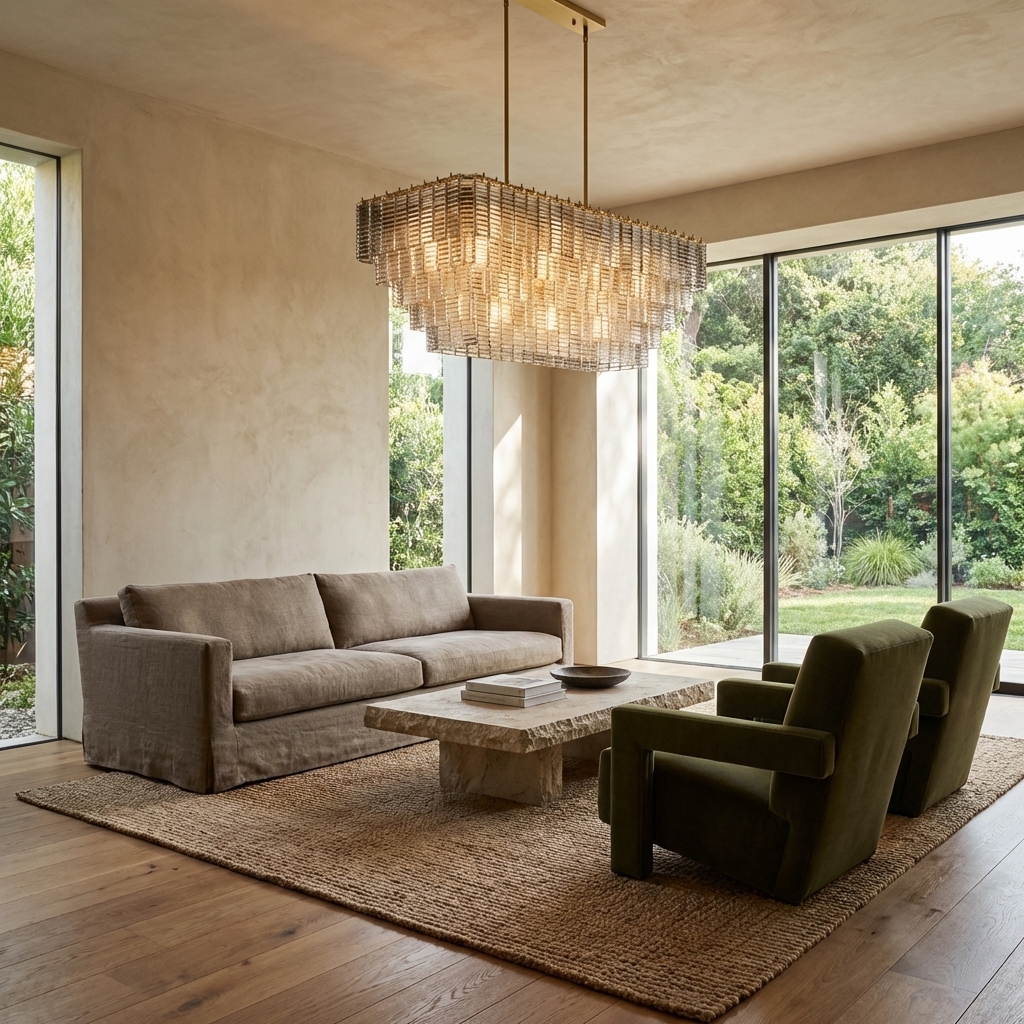 With its generous 59-inch width and layered woven-glass construction, the Tessara Clear Glass Rectangle Chandelier 59" is especially suited for placement above long dining tables, kitchen islands, or large gathering spaces where both illumination and visual impact matter.