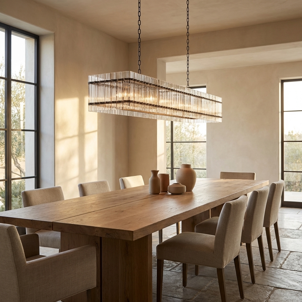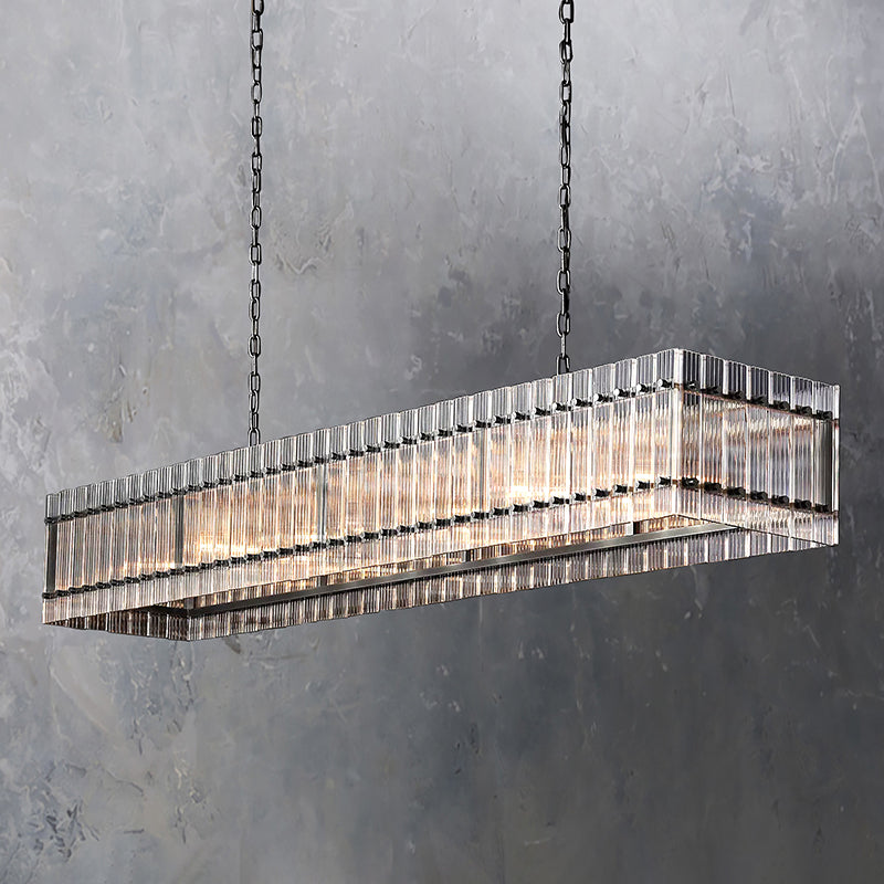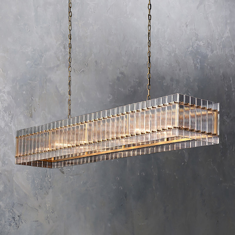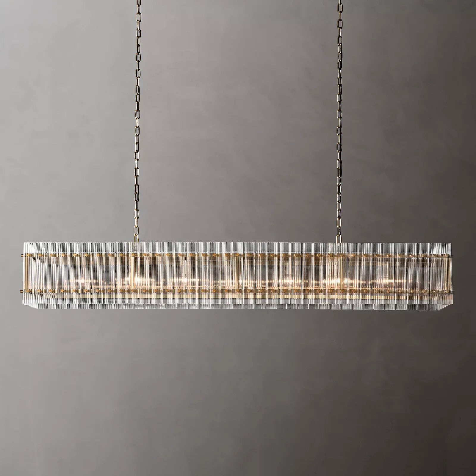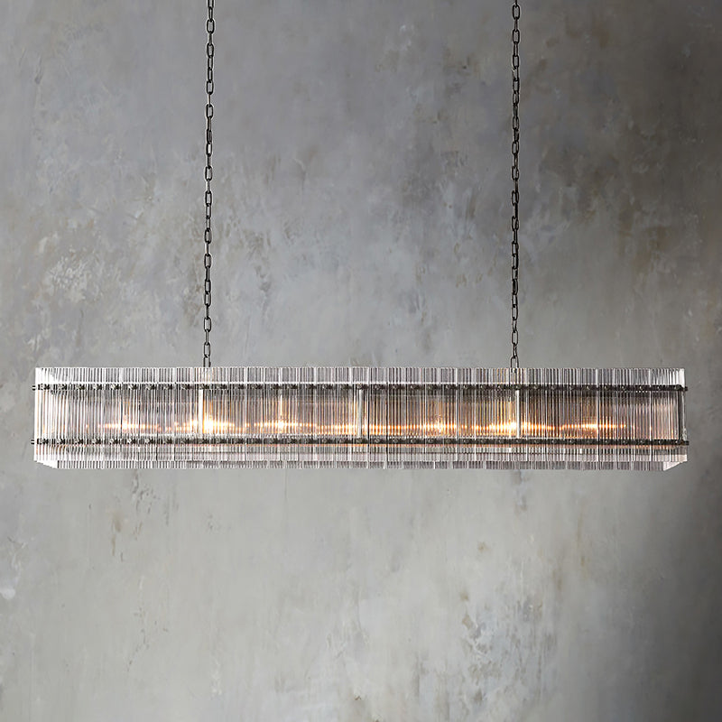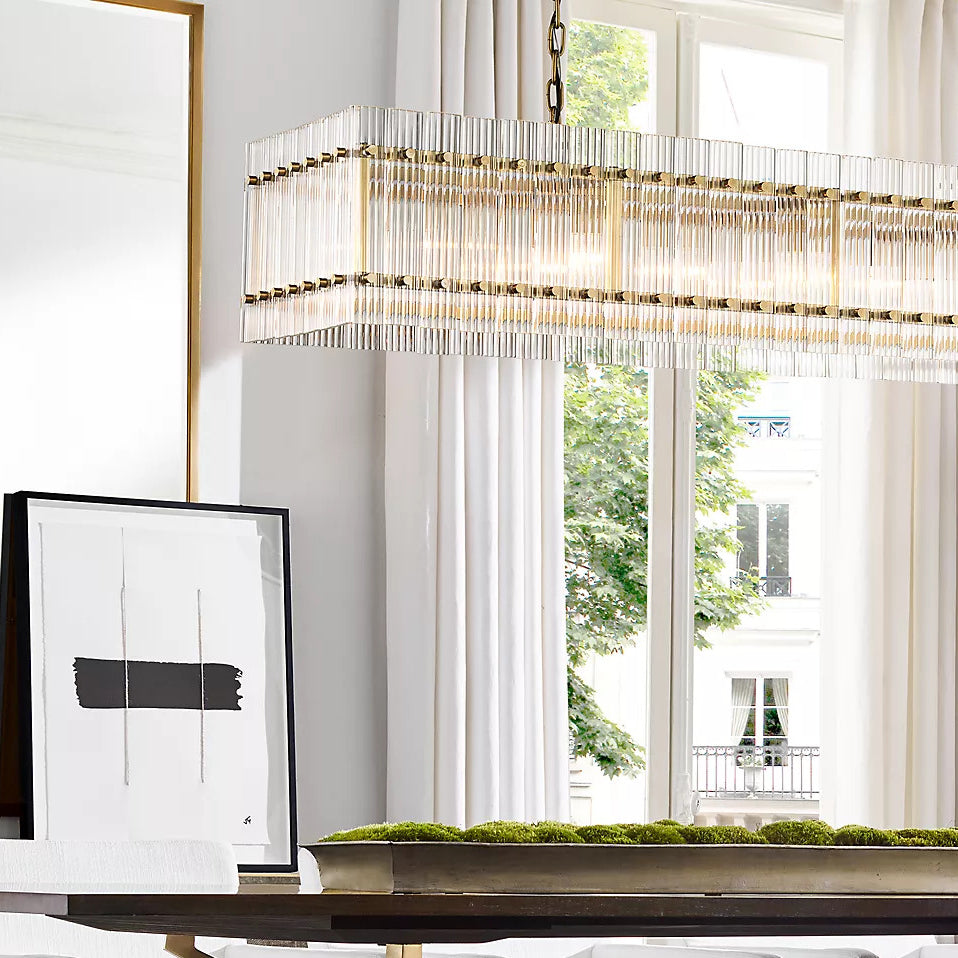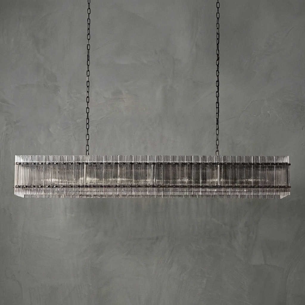 Defined by vertically channeling light through hand-fluted glass rods, the Vetreria Rectangle Chandelier 72" offers both architectural presence and luminous texture. Its elongated rectangular form makes it especially suited for dining tables, kitchen islands, and spacious interiors seeking a polished statement fixture.